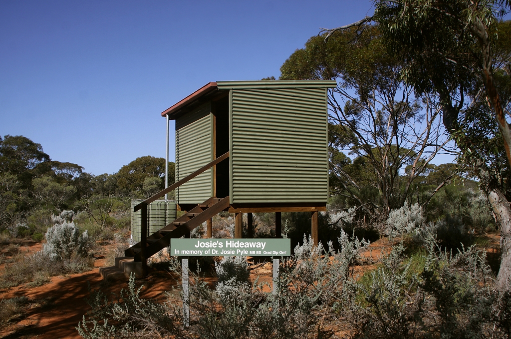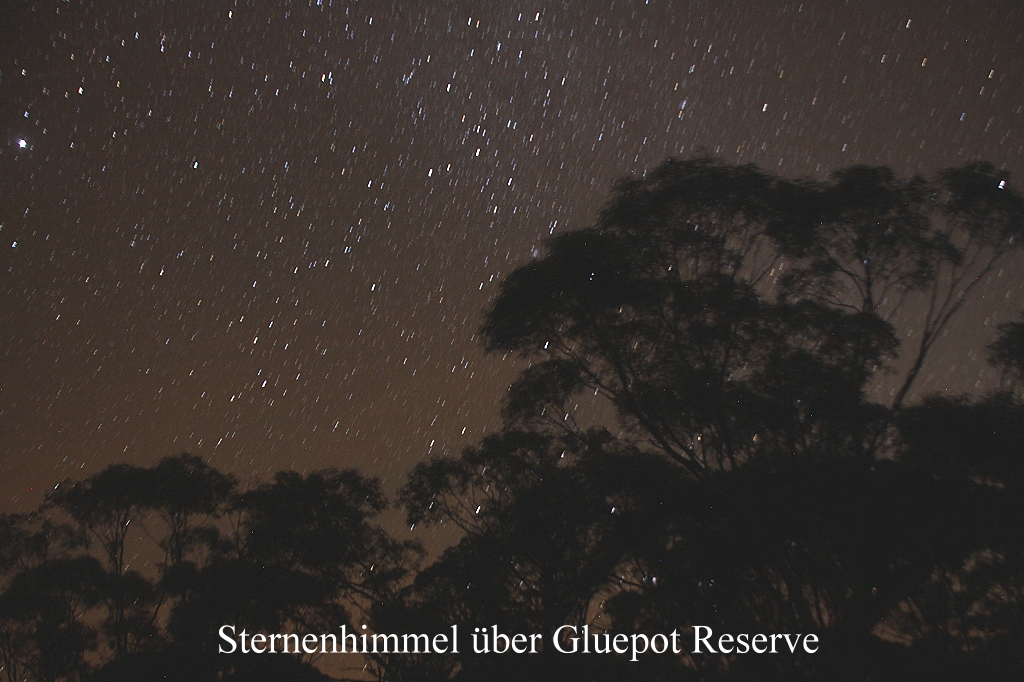 Tomoko gelangen ein paar schöne Fotos. Um 15.00 Uhr erreichten wir wieder unser Auto und fuhren über den Track 8 und 6 zum Hide am Froggy Dam. Hier war es aber auch sehr still. Es war sowieso jetzt langsam Zeit zu unserem Campingplatz zurückzufahren. Nach insgesamt 45 km Rundfahrt durchs Gelände kamen wir um 16.15 Uhr dort an. Inzwischen war es vollkommen windstill geworden und die Sonne verschwand langsam hinter den Bäumen im Westen. Eine unglaubliche Ruhe lag über der Landschaft. Wir hatten heute den ganzen Tag keine Menschenseele getroffen, ein wirklich seltenes Ereignis… Tomoko begann mit den Vorbereitungen fürs Abendessen. Ich fing schon mal an, Tagebuch zu schreiben. Bei den letzten Strahlen der untergehenden Sonne nahmen wir an unserem Picknicktisch Platz. Es gab heute chinesische Bratnudeln in merkwürdiger Zitronensauce und Laksa (eine Suppe, die aus Singapur stammt). Tomoko war zunächst mit ihrem Kochergebnis nicht ganz zufrieden, aber in der frischen Luft schmeckte doch alles recht gut. Da es um 18.00 Uhr wieder stockdunkel war, zogen wir uns in unser Auto zurück. Tomoko sortierte Fotos und versuchte einzelne Vögel anhand ihres Vogelbuches zu identifizieren. Ich schrieb derweil mein Tagebuch zu Ende. Gegen 19.00 Uhr war ich fertig damit. Die Zeit hier im Gluepot Reserve war einmalig schön. Nicht nur der Vogelreichtum sondern auch die einsame Natur hatte uns sehr beeindruckt. Morgen werden wir die Gegend verlassen und uns auf den Weg in die ungefähr 450 km entfernten Flinders Ranges machen. Wir gingen noch mal ins Freie und betrachteten den prächtigen Sternenhimmel, der sich in seltener Klarheit in der trockenen Luft zeigte.