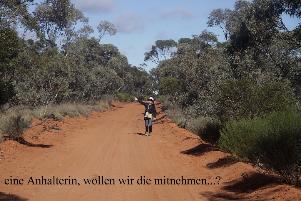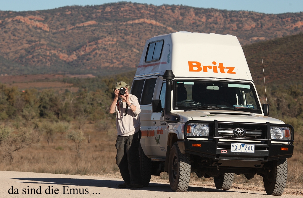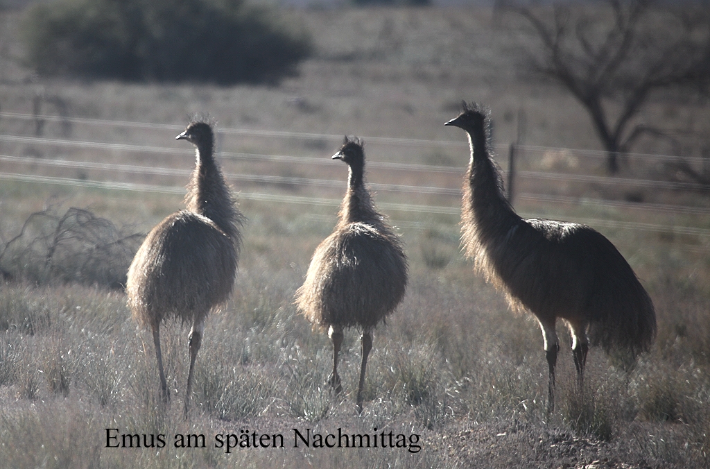 Ein tolles Bild in der schon tiefstehenden Sonne! Nach 35 km erreichten wir die Abzweigung zum Rawnsley Caravan Park, unserem heutigen Ziel. Gerade waren wir auf die staubige Schotterstraße abgebogen, als 4 Emus ganz nah an uns vorbeischritten und offensichtlich nicht so scheu waren, wie die anderen, die wir schon gesehen hatten. Wir konnten sogar das Auto verlassen um einige Fotos zu machen. |