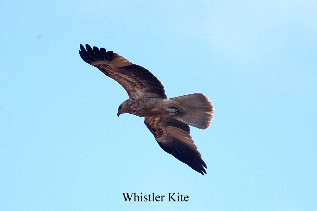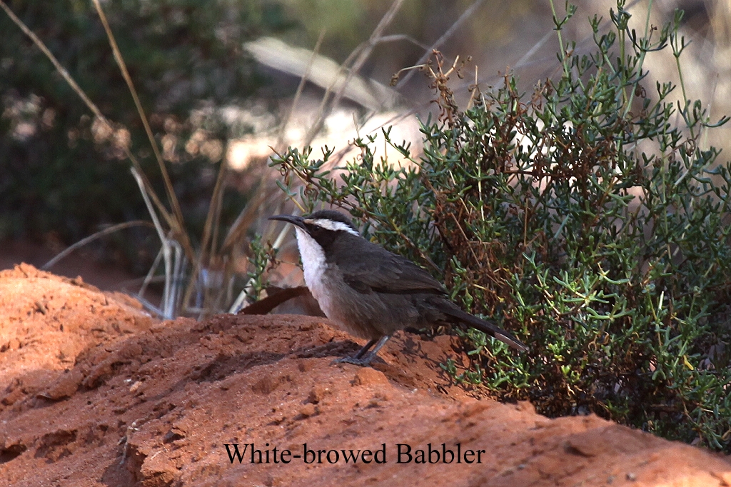 Nun fuhren wir zu unserem Campingplatz zurück, luden die restlichen Sachen ein (Campingmöbel, Markise mit Stangen, Wasserkanister) und begaben uns um 9.50 Uhr auf die Weiterreise. Kaum waren wir losgefahren, hüpfte auch schon ein Känguru auf den Weg. Tomoko meinte, dass es ein Euro (eine Känguru-Art, kein Geld) war. Insgesamt sahen wir 4 Kängurus, kann aber auch immer das gleiche Tier gewesen sein, das parallel zum Fahrweg durch die Büsche hüpfte, wer weiß… Ein Stück weiter auf Track 7 kreuzte ein Schwarm Babbler mit ihren typischen lauten Stimmen unseren Weg. Wir stiegen aus und konnten auch noch einige andere Arten beobachten, u.a. White-browed Babbler, Brown-headed Honeyeater, |
