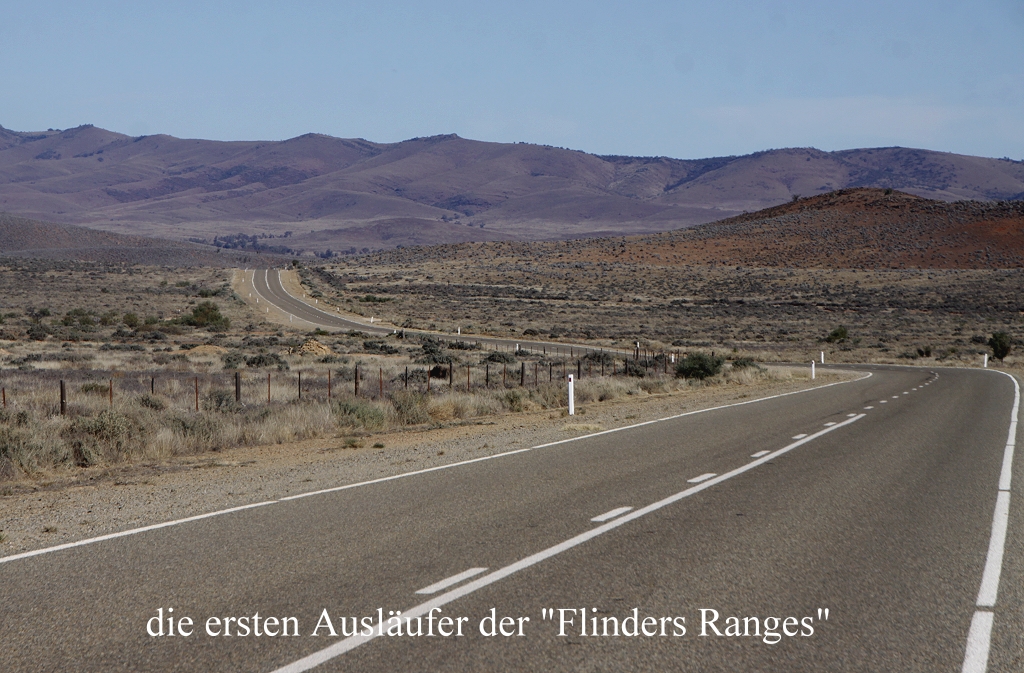 Wir verließen den Platz und fuhren erstmal zur Bibliothek (Library), wo wir wieder mit unseren in Kangaroo Island erworbenen Zugangspässen kostenlosen Internetempfang hatten. Wir nutzten die Gelegenheit und blieben bis 10.40 Uhr dort. Nun wurde es aber langsam Zeit loszufahren. Heute wollten wir die noch ca. 200 km entfernten Flinders Ranges erreichen. Zunächst tankten wir am Ortsausgang beide Tanks voll, dann ging es los über eine sehr einsame Straße Richtung Norden der schon hochstehenden Sonne entgegen. Es gab nur ganz wenige kleine Ansiedlungen auf der Strecke.