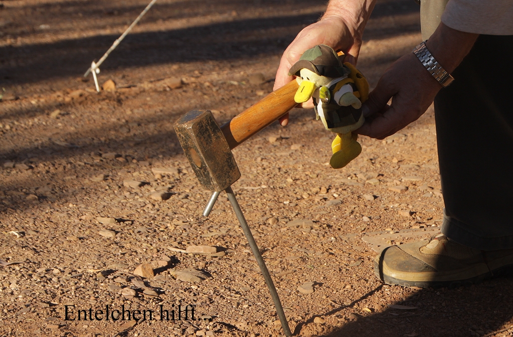 Um 15.40 Uhr kamen wir nach weiteren 4 km am Caravan-Park an. Obwohl der Platz gut besucht war, gab es noch etliche freie Plätze. Wir bekamen einen Platz mit Strom- und Wasserversorgung für 33,- $ pro Nacht. Da wir nicht wussten, wie lange wir bleiben wollten, buchten wir erst mal nur für 2 Nächte. Morgen schauen wir uns dann mal um, besonders der Wilpena Pound ist auch eine Alternative. Ich baute wie immer alles auf, wobei Entelchen mir diesmal half... |