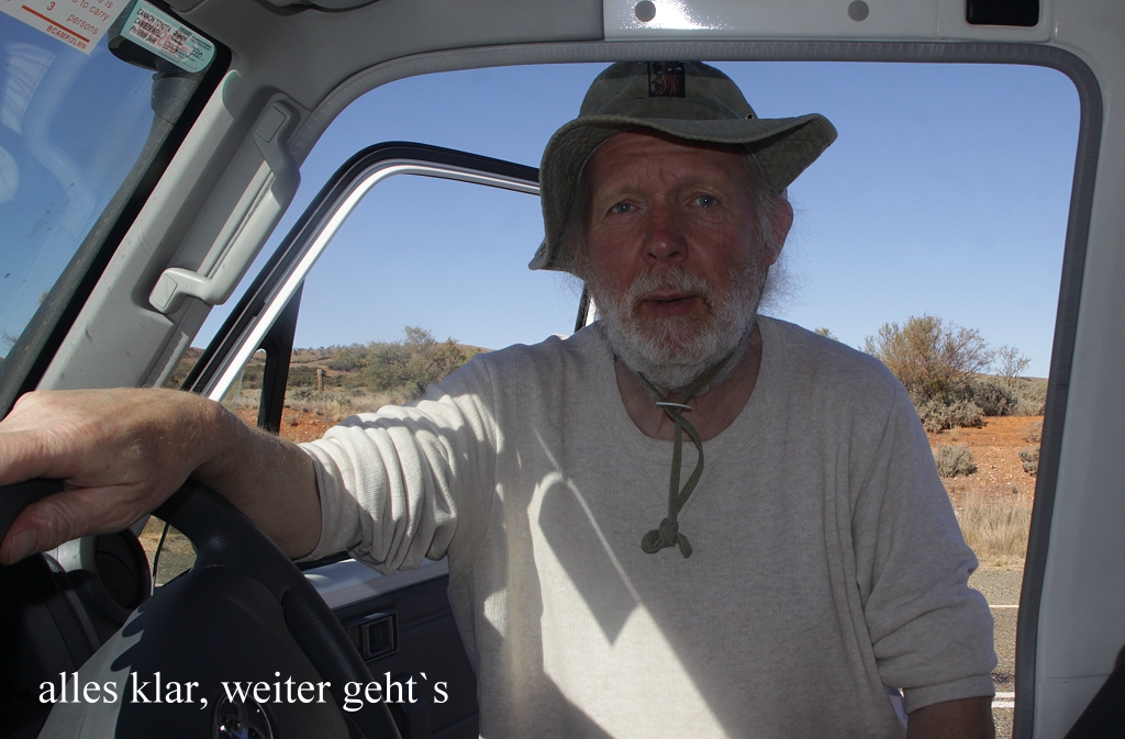 In der Zwischenzeit kaufte ich in einem Laden nebenan einen Gummischaber, um unsere morgens immer stark innen beschlagenen Fensterscheiben wieder durchsichtig machen zu können, sowie eine Straßenkarte mit zahlreichen Details vom Gebiet der Flinders Ranges mit allen befahrbaren Straßen, auch den nur für Vierradantrieb empfohlenen Strecken. Die Sonne schien sehr intensiv vom wolkenlosen blauen Himmel, nur der kühle trockene Wind blies ziemlich kräftig. Nachdem wir weiterfuhren Richtung Hawker wurde die Gegend immer einsamer. Kaum mal ein Auto kam uns entgegen. |