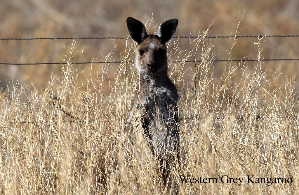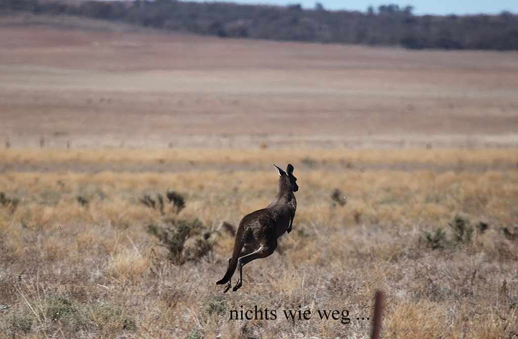 45 km vor Hawker zeigte sich ein Emu direkt am Straßenrand, aber als wir wendeten um ein Foto zu machen war er schon wieder dabei wegzurennen. Ein kurzes Stück weiter kreisten 3 Adler (Wedge-tailed Eagle) über unseren Köpfen und schraubten sich mehr und mehr in die Höhe, bis sie nur noch als kleine dunkle Punkte am Himmel zu erkennen waren. Einige km weiter saß ein Falke (Nankeen Kestrel) auf einem kleinen Strauch neben der Straße, der ruhig sitzen blieb, als ich zurücksetzte, so dass Tomoko endlich einige brauchbare Fotos machen konnte. Hin und wieder tauchte mal ein Känguru (Western Grey Kangaroo) auf, die meistens jedoch ziemlich scheu davonsprangen. |