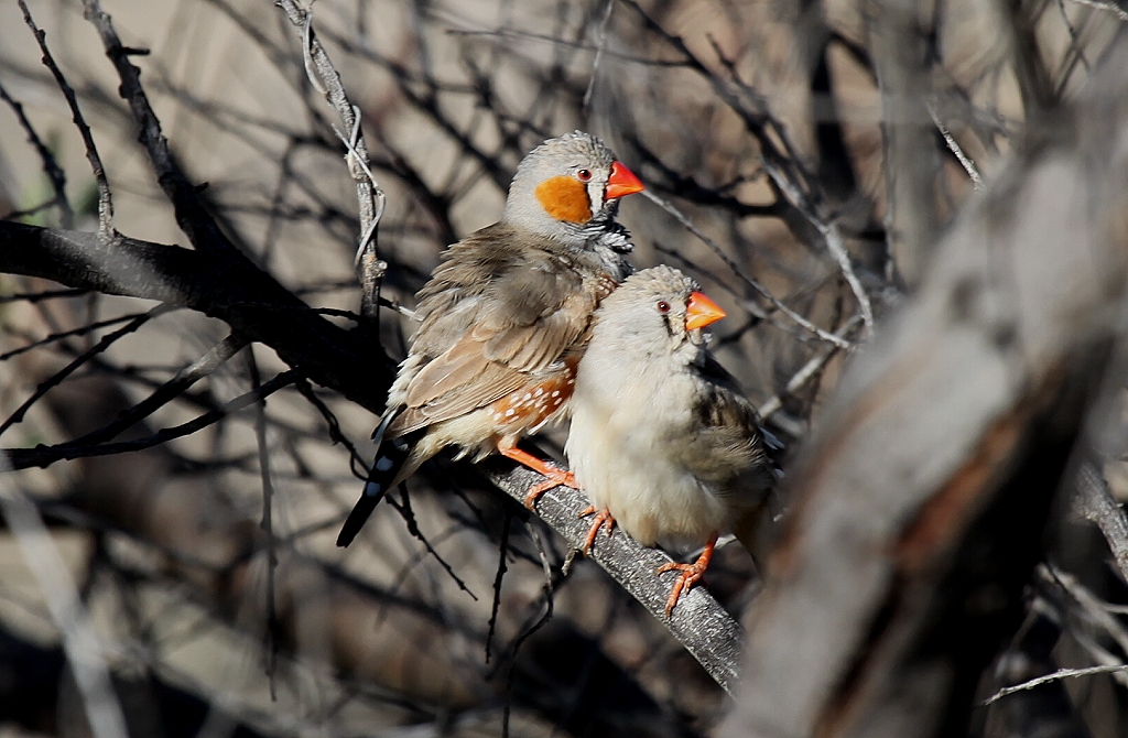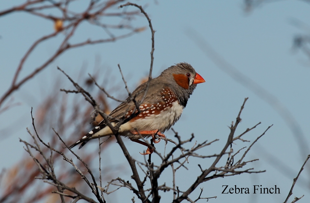 Endlich erreichten wir um 14.05 Uhr Hawker, den letzten Ort vor den Flinders Ranges. Hier, so hatte ich im Internet gelesen, sollte man sich noch mit Lebensmittel-Vorräten eindecken können. Als wir aber den einzigen kleinen Laden, der an eine Tankstelle angeschlossen war, inspizierten bekamen wir doch einen gehörigen Schrecken. Es gab so gut wie nichts hier, und das wenige was es gab war vollkommen überteuert. Wir kauften ein schlabberiges Toastbrot und ein kleines Stück Käse, und das für 10,- $. Eine einzelne Avocado sollte 4 $ kosten. Ich weiß nicht, was sich dieser Informant im Internet mit seinem Tipp gedacht hat, hier seine Lebensmittelvorräte aufzustocken ist ja verrückt….Tomoko überlegte fieberhaft, wie viele Tage sie mit den noch bei uns vorhandenen Lebensmitteln auskommen kann. Nach einigem hin und her stellten wir fest, dass wir wohl noch einige Tage hinkommen. Wenn es gar nicht mehr geht, müssen wir ein Stück zurückfahren, eventuell bis Quorn oder aber sogar bis Port Augusta, mal sehen… Wir fuhren etwas besorgt weiter, wurden aber bald entschädigt, als direkt neben der Straße ein großer Schwarm von kleinen Vögelchen auftauchte. Beim näheren hinsehen stellten wir fest, das es sich um Zebrafinken (Zebra Finch) handelte, die mit ihren roten Schnäbelchen teils auf der Straße sitzend, teils in den trockenen Büschen nach Futter pickten. |