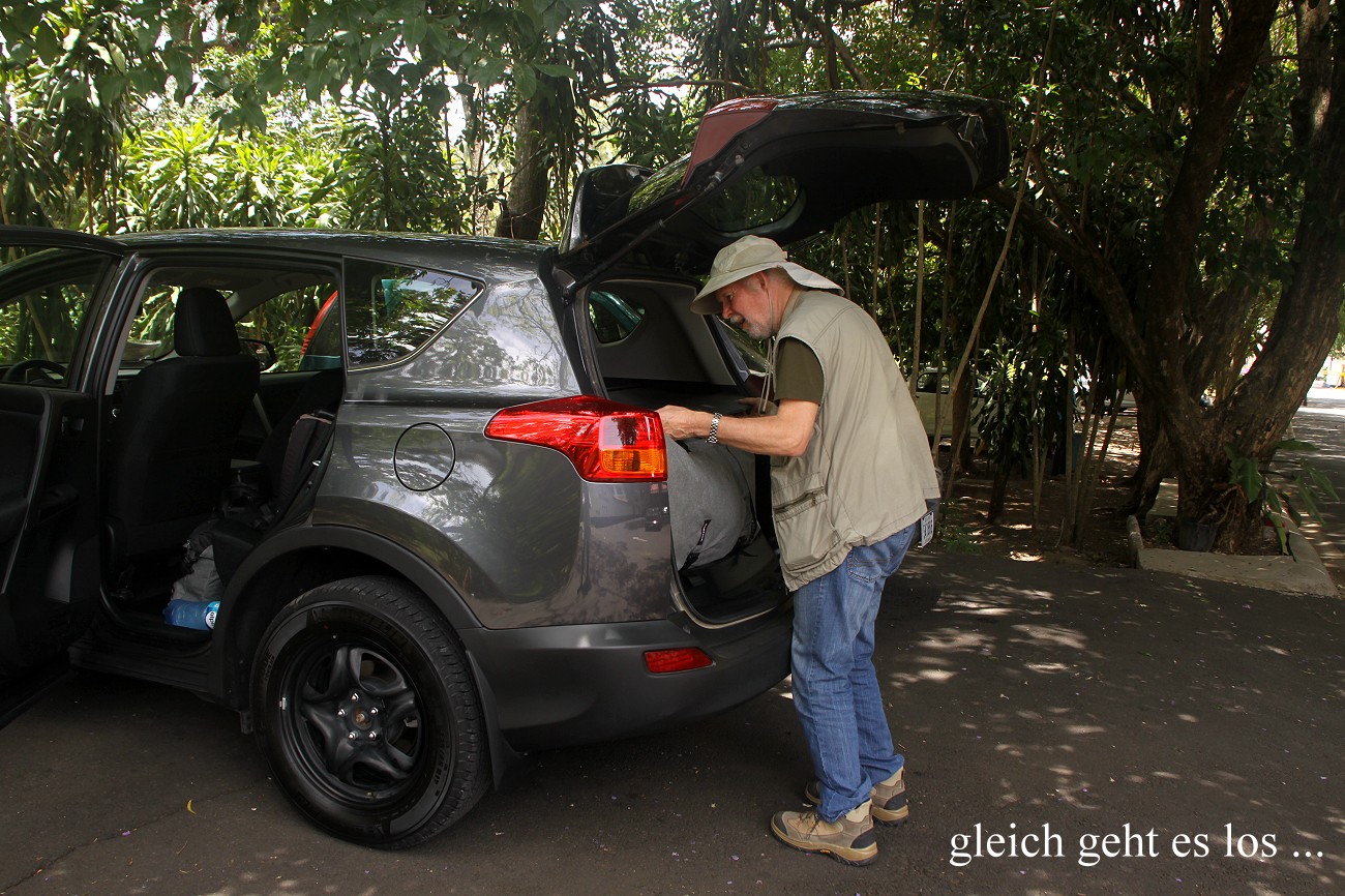 Nach einer erfrischenden Dusche packten wir unsere Koffer. Um 10:00 h soll unser Mietwagen ans Hotel geliefert werden, mal sehen ob das klappt. Wir hatten noch etwas Zeit, so dass ich schon mal mit Tagebuch anfing. Am geöffneten Fenster unseres Zimmers wurde es merklich wärmer. Die Sonne kam langsam durch und schien uns direkt ins Zimmer. Gegen 10:20 ging ich mal zur Rezeption um zu sehen, was unser Mietwagen macht. Die freundliche junge Dame dort telefonierte mit Europcar. Es gäbe eine kleine Verzögerung mit der Auslieferung, in 10 - 15 Minuten sei das aber Auto da. Es wurde dann aber doch 11:10 h als das Auto, ein nagelneuer Toyota RAV 4x4 automatic, gebracht wurde. Der Agent von Europcar entschuldigte sich vielmals für die Verspätung, na ja, wir hatten es ja nicht besonders eilig. Nachdem alle Formalitäten erledigt waren, luden wir unser Gepäck ins Auto und fuhren los Richtung Puerto Viejo, unserem heutigen Reiseziel an der karibischen Küste. Ich hatte mein GPS programmiert. Es zeigte auch die Richtung an durch enge Gassen von Alajuela und die Vorstädte von San José. Uns fielen sofort die hohen Zäune und starken Gitter um die Häuser auf. Der Verkehr war ziemlich chaotisch, doch wir kämpften uns tapfer voran. |