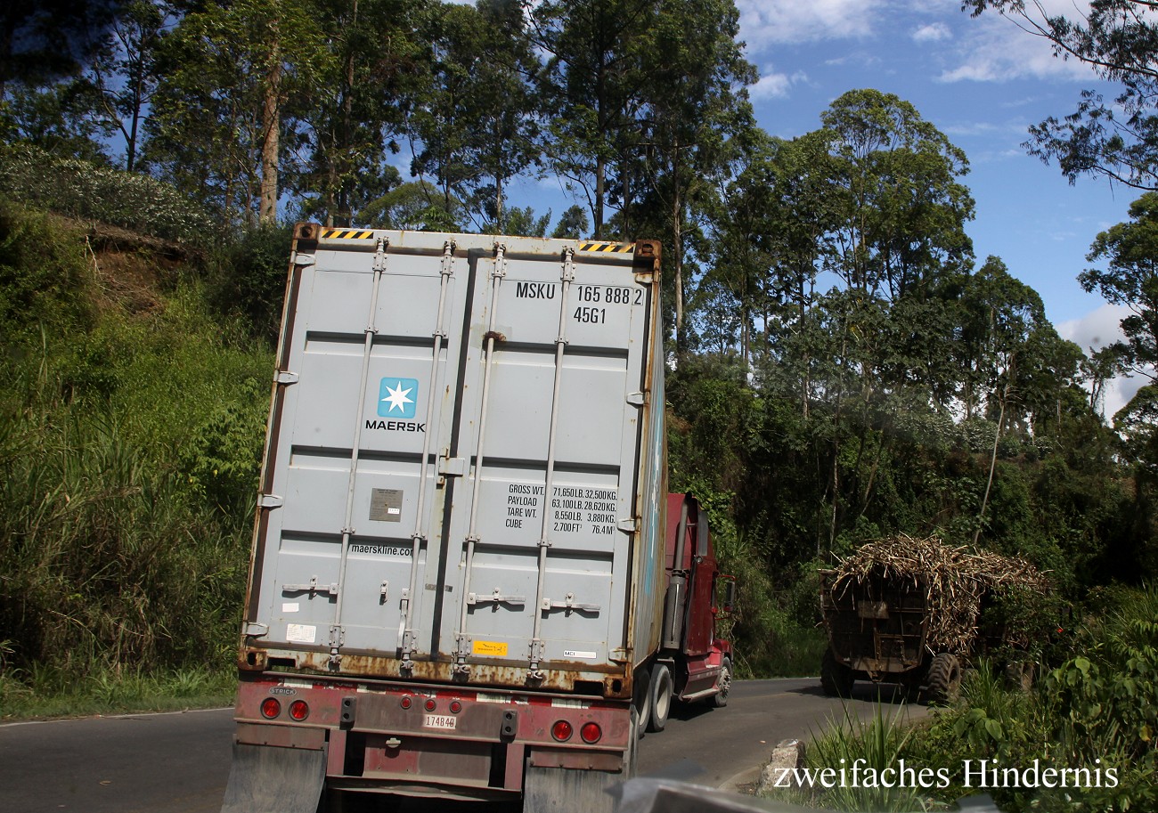 Irgendwann fiel mir auf, dass mit unserer vom GPS gezeigten Richtung etwas nicht stimmte. Als ich anhielt und mal etwas näher hinschaute, stellte ich fest, dass wir weit entfernt vom gewünschten Kurs waren. Ich hatte kurz nach der Abfahrt auf den Knopf "Strecke neu berechnen" gedrückt und das Gerät hatte ein völlig andere Strecke berechnet, nicht durch den Braulio Carillo Nationalpark, sondern über Cartago und weiter über Turrialba. Wir waren schon zu weit auf dieser neuen Route vorangekommen um noch mal den Kurs zu ändern. Also folgten wir der vorgeschlagenen Strecke, auch wenn diese insgesamt rund 30 km länger war. Hinter Cartago verließen wir das Hochtal und eine schmale Straße wand sich in engen Serpentinen hoch in die Berge. Das Wetter war noch warm und sonnig. Wir durchfuhren zahlreiche Zuckerrohrplantagen. Mehrfach wurden wir durch schwere Lastwagen (Container Transporter) oder Traktoren mit Zuckerrohr beladenen Anhängern aufgehalten. |