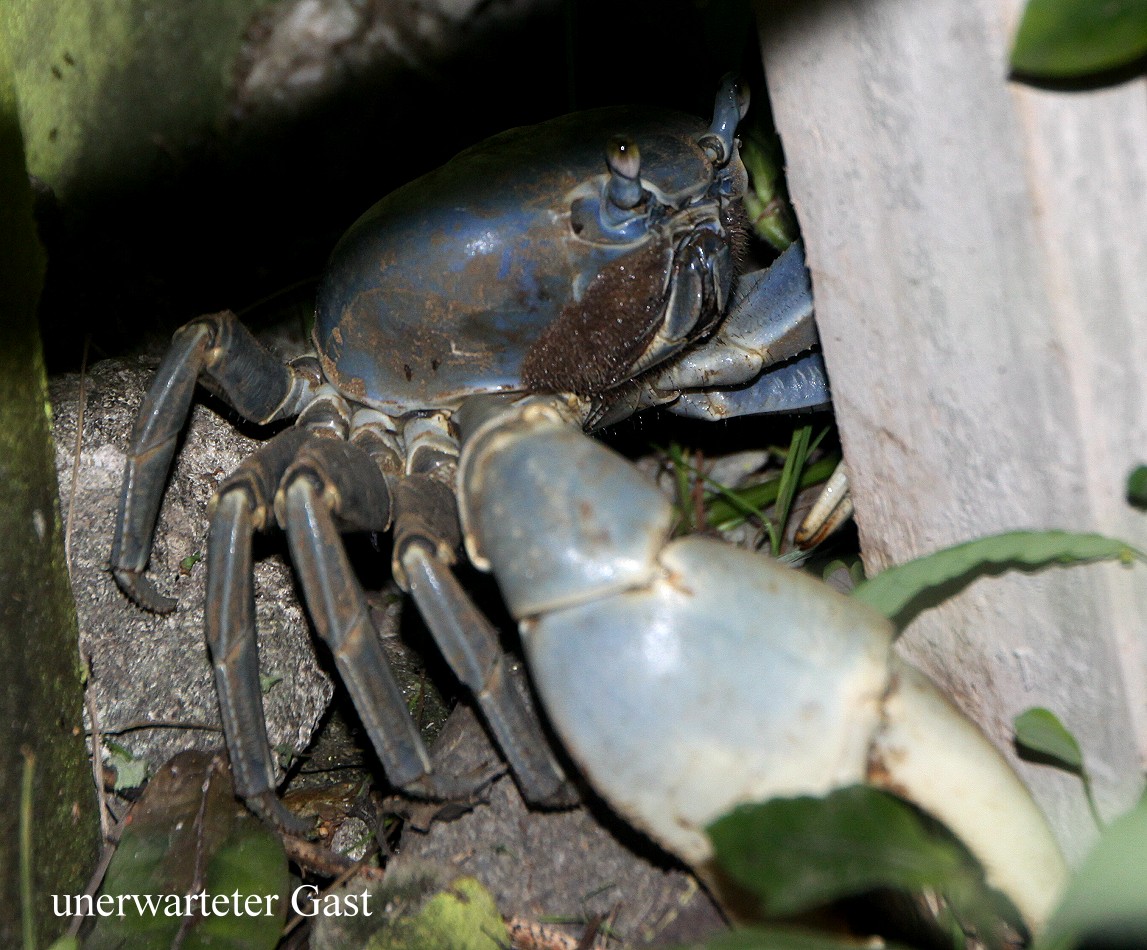 Ab hier wurde der Verkehr sehr ruhig und nach kurzer Zeit hatten wir die Plantagen hinter uns gelassen. Stattdessen umgab uns dichter Dschungel. Der Himmel war inzwischen stark bewölkt und es regnete teilweise. Wir passierten Cahuita und den gleichnamigen Nationalpark. Jetzt waren es nur noch 20 km bis Puerto Viejo, unserem heutigen Ziel. Am späten Nachmittag kamen wir dort an. Puerto Viejo ist ein typischer Badeort mit zahlreichen Bars, Restaurants, kleinen Hotels und Lodges sowie natürlich zahlreichen Touristen. Wir hatten etwas Mühe die "Cabinas Kire" zu finden, die von einem Deutschen, dessen Vater in Esslingen als Friseur arbeitet, und seiner costaricanischen Frau betrieben werden. Es gibt nur 2 Bungalows, ein weiterer ist vor kurzem den aggressiven Termiten zum Opfer gefallen. Es war alles sauber und geräumig, allerdings auch sehr einfach eingerichtet. Ein Kühlschrank und Kochvorrichtung sind vorhanden. Im Schlafzimmer ist ein großes Moskitonetz übers Bett gespannt. Dort gibt es auch einen Ventilator, den wir uns wegen der tropischen Temperaturen auch im Wohnzimmer gewünscht hätten. Nachdem wir unsere Sachen aus dem Auto geräumt hatten, gingen wir ins kleine Restaurant vorne an der Straße. Tomoko hatte leider Migräne. Das Essen war sehr lecker, Gemüse mit Reis und für mich noch etwas gebratenes Schweinefleisch. Ein große Krabbe, die sich offensichtlich verirrt hatte, tauchte zwischen den Stuhlbeinen auf, verschwand aber bald wieder Richtung Strand. |