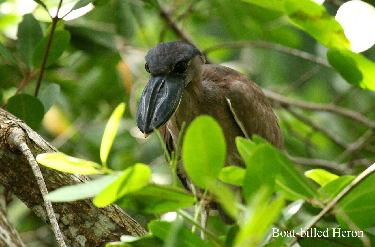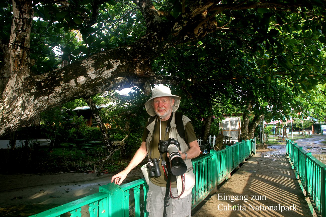 Gegen 9:00 h waren wir wieder zurück beim Parkeingang. Hier befindet sich ein kleines Restaurant "Kelly Creek" an einem kleinen Bach, der ins Meer mündet. Da wir Hunger verspürten, kam Tomoko auf die Idee, es hier mal mit einem Frühstück zu versuchen. Ein freundlicher älterer Mann kam uns entgegen und zeigte uns eine Stelle hinter seinem Haus, wo er uns verschiedene Tiere zeigen wollte. Er rief laut „Roberto“ und „Ben“ und erklärte uns dann, dass er so 2 Kaimane anlocken wollte, die wohl hier leben. Es zeigte sich aber leider kein Kaiman, stattdessen kamen neugierig einige Vögel mit sonderbaren Schnäbeln (Boat-billed Heron) aus den Mangroven. |