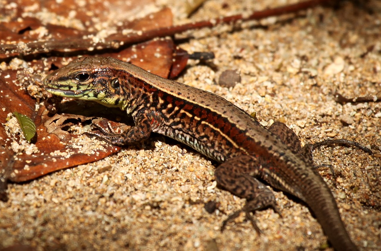 Gegen 7:30 h kehrten wir um. Bis dahin hatten wir viele Stimmen im Urwald gehört, aber außer einigen Vögeln (Western Slaty-Antshrike) und Eidechsen nicht viel gesehen. |