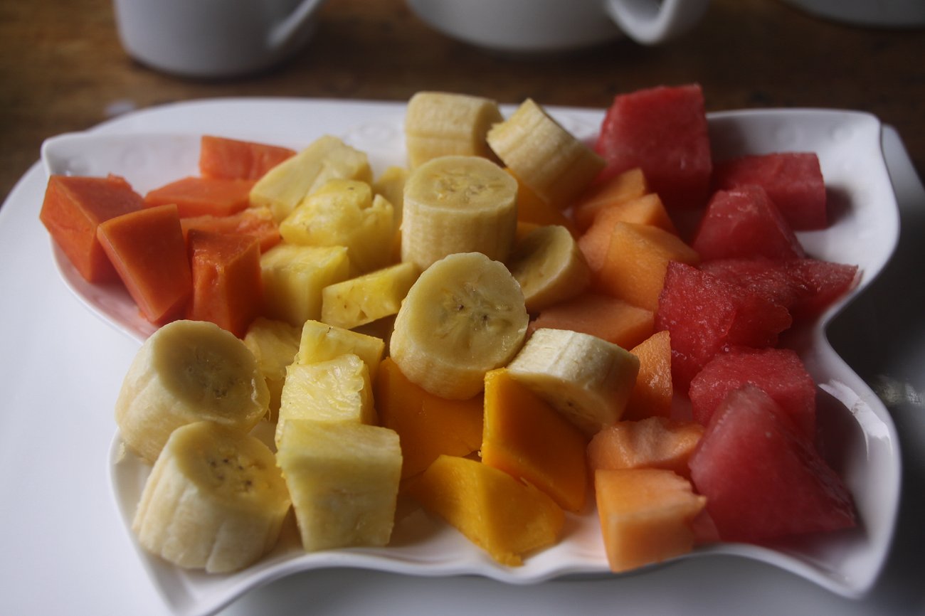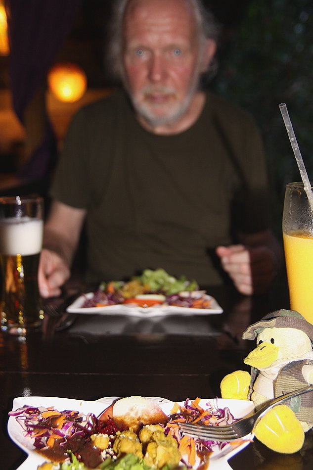 Ein Hund war mit einer Leine festgebunden. Dieser Hund liebt es, Kaimane in den Schwanz zu beißen, was diesen wohl nicht gefällt. Der Hund wäre in einem eventuellen Kampf hoffnungslos unterlegen... Wir nahmen im Freien auf der Terrasse Platz, auf der eine angenehme Brise vom nahen Meer herüberwehte.. Zum Frühstück bestellten wir je einen gemischten Obstteller und warmes Baguette mit selbstgemachter Marmelade (Kürbis und Mango). Dazu tranken wir Kaffee. Tomoko bestellte sich noch einen Mango-Milkshake, frisch gemacht und sehr erfrischend, köstlich... |