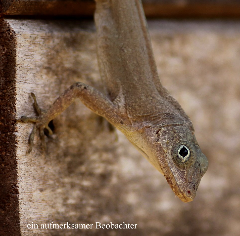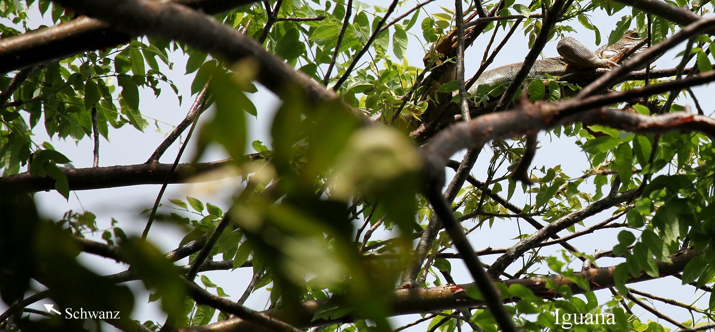 Auch einige vorbeikommende Touristen blieben stehen und schauten ebenfalls begeistert zu. Ein Einheimischer zog mich einen Schritt zurück, war ich doch ein paar Meter abseits des sandigen Trails für bessere Sicht in die dichte Vegetation getreten, wo sich plötzlich eine große Menge Ameisen (Army Ants) zeigte, deren Biss sehr schmerzen soll. Da hatte ich aber Glück gehabt. Etwa 20 m von uns entfernt kletterten plötzlich zwei Nasenbären (Agutis) einen Baumstamm hoch. Sie kletterten ein wenig umher und verschwanden wieder spurlos im dichten Unterholz. Dort wo wir die Tukane gesehen hatten, sahen wir etwas Großes sich durchs Laub bewegen. Es war ein riesiger Leguan (Iguana), der dort hoch oben regungslos in der Sonne sitzen blieb. Diese Tiere können bis zu 2 m lang werden. Der dort oben saß, war ein solch großes Exemplar. |