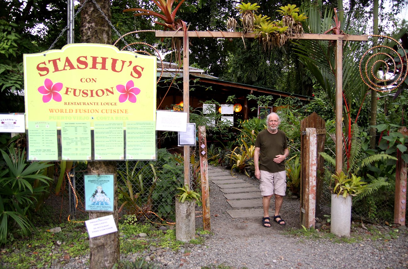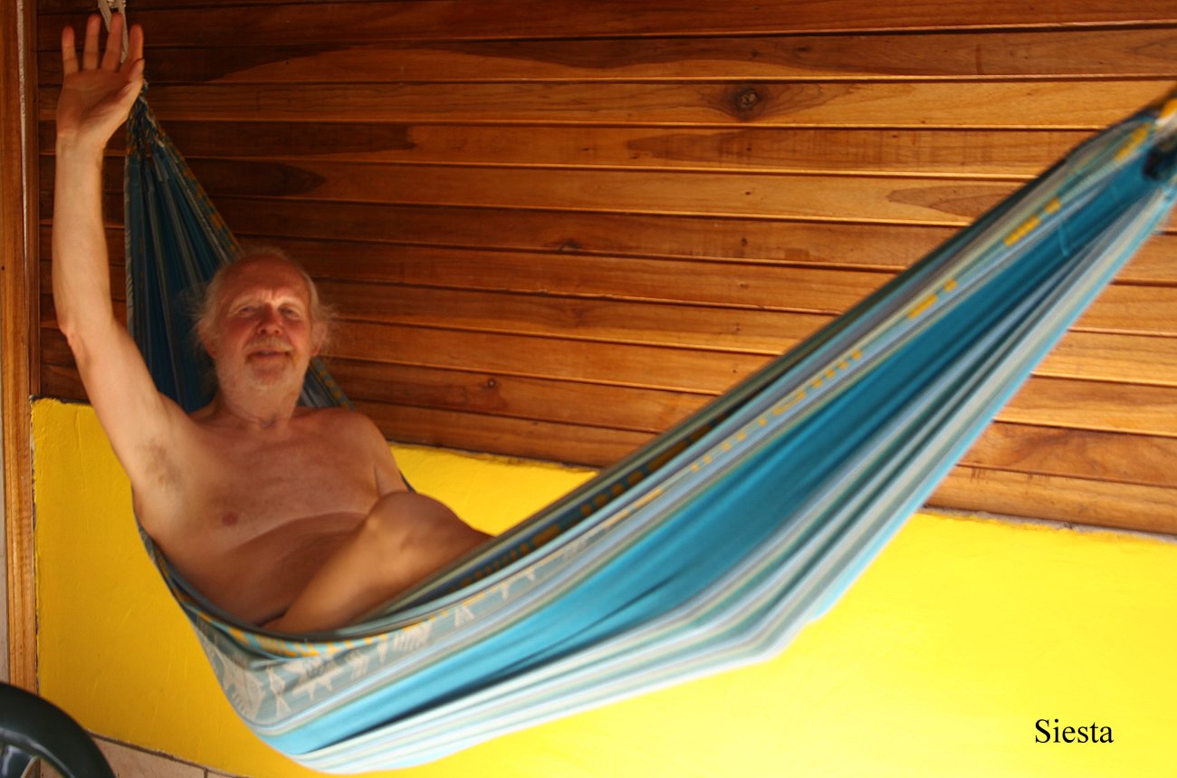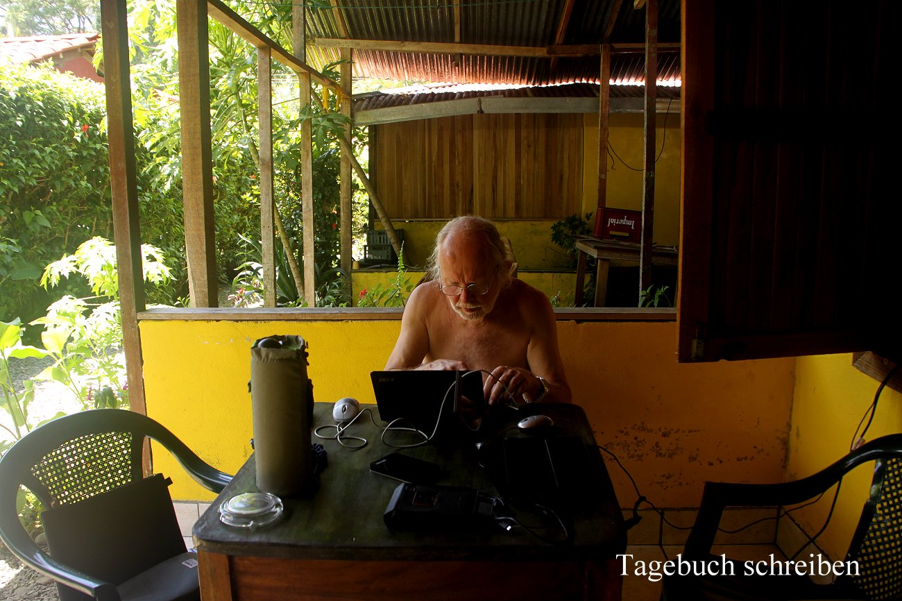 Wir zahlten unsere Rechnung (17,- $) und gingen zum Auto zurück, das in der prallen Sonne sich mächtig aufgeheizt hatte. Mit Hilfe der Klimaanlage schafften wir aber schnell wieder angenehme Temperaturen im Inneren. Wir fuhren zurück nach Puerto Viejo. Im Bungalow angekommen, duschten wir beide erst mal ausgiebig. Anschließend setzten wir uns auf die schattige Veranda und schlossen unsere Laptops an. Während ich schon mal mit meinem Reisebericht anfing, übersetzte Tomoko etwas. So verbrachten wir die Zeit während der größten Hitze des Tages ruhig im Schatten, während ich auch die bequeme Hängematte mal ausprobierte. |