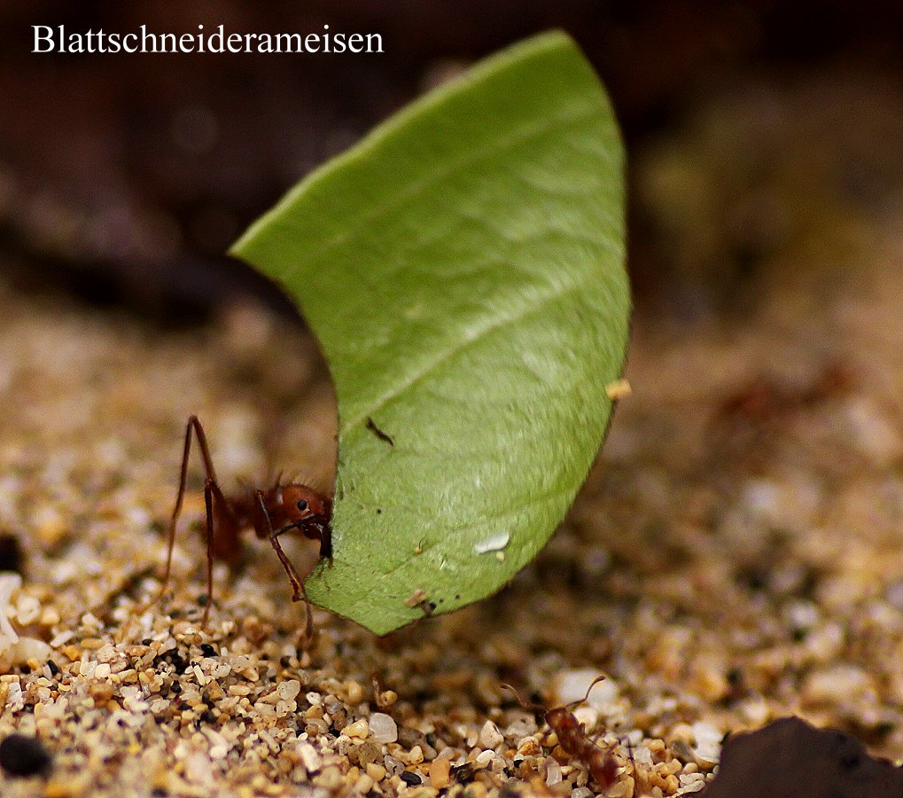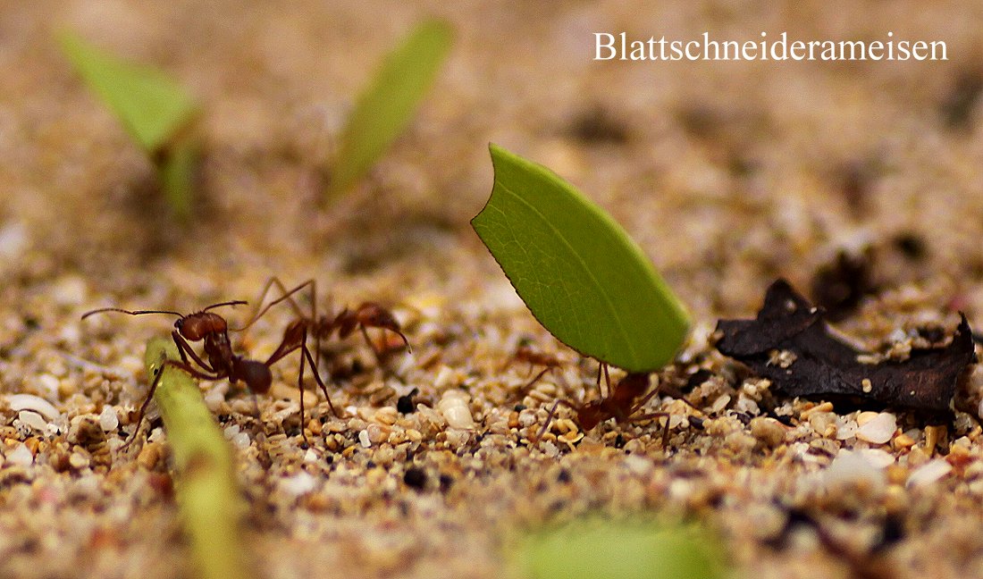 Auf dem sandigen Trail waren wieder zahlreiche Blattschneiderameisen unterwegs. Es lagen aber auch zahlreiche kleine grüne Blattstückchen auf dem Weg.Offensichtlich hatten die sintflutartigen Regenfälle gestern Abend den Weg so überschwemmt, dass die Ameisen ihre schon abgeschnittenen Blätter nicht weiter transportieren konnten. |