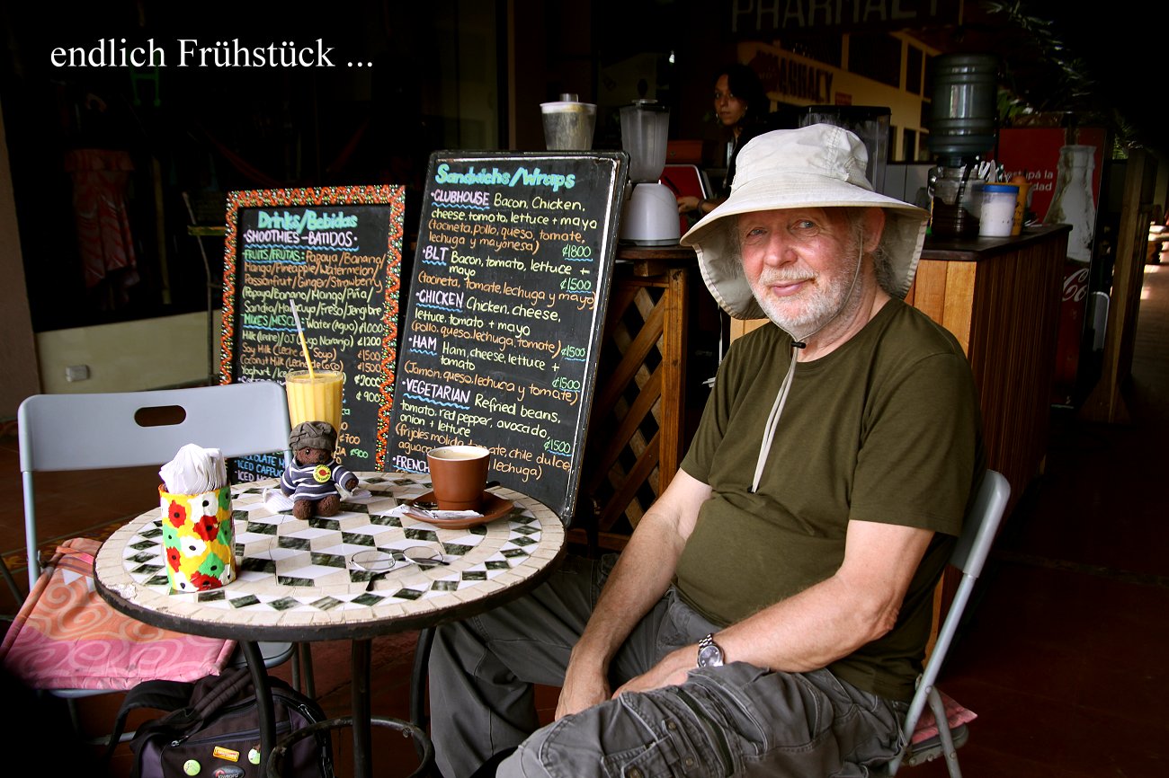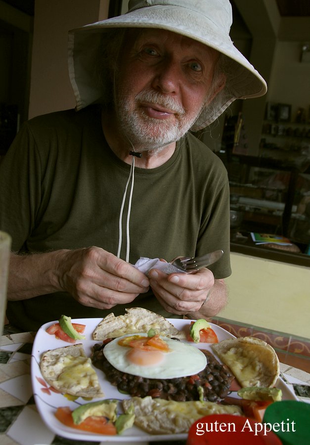 Als wir jedoch das Naturschutzgebiet betreten wollten, hinderte uns der kleine Fluss daran, da er hier ins Meer mündet und es keine Brücke gibt. Einige Leute mit Flip-Flops wateten durch das knöcheltiefe Wasser, aber wir mit unseren Wanderschuhen wollten da nicht unbedingt durch. Also fuhren wir wieder zurück. Gegen 12:20 h kamen wir an unserem Bungalow an. Jetzt schnell die verschwitzten Klamotten aus und schnell eine Dusche, herrlich...Die nächsten Stunden verbrachten wir gemütlich auf unserer Terrasse. Ich fing schon mal an Tagebuch zu schreiben, Tomoko sicherte alle Fotos auf Computer und externer Festplatte. Das Wetter war inzwischen richtig sonnig geworden und die Temperatur stieg auf über 30° bei 80% Luftfeuchtigkeit... Um 16:00 h machten wir uns zu Fuß auf zu einem kleinen Reisebüro in der Nähe um für das "La Selva Hotel" für morgen eine Reservierung vorzunehmen. Leider funktionierte das Internet in unserer Cabina nicht, sonst hätte ich das selbst in die Hand genommen. Die sehr freundliche Angestellte machte telefonisch alles klar. Für 130,- $ buchte sie ein Zimmer für uns. Da es zunächst keine genaue Wegbeschreibung für das Hotel gab, gingen wir zunächst zum Essen. Danach wollten wir uns noch mal melden, um genauere Informationen zu erhalten. Als Restaurant wählten wir wieder wie gestern das „Stashu“ aus. Wieder schmeckte das Essen sehr gut. Leider wurde Tomoko ständig von Moskitos belästigt, die mich merkwürdigerweise verschonten. Nach dem Essen gingen wir nochmals zum Reisebüro. Die versprochenen Koordinaten für das Hotel waren zwar nicht eingetroffen, dafür aber eine kleine Wegbeschreibung, mal sehen ob wir damit morgen zurechtkommen. Zurück im ziemlich heißen Bungalow duschte ich mal wieder und setzte mich nass auf die Terrasse. Das war recht angenehm bei noch 27° und 86% Luftfeuchtigkeit. Ich schrieb meinen Tagesbericht für heute fertig. Wir blieben noch ein wenig sitzen und genossen die angenehme Nachtluft. Heute war der Himmel sternenklar, weit und breit kein Regen in Sicht. Hoffentlich bleibt das morgen so, wenn wir zurück in die Berge fahren. Gegen 20:30 h gingen wir schlafen. |