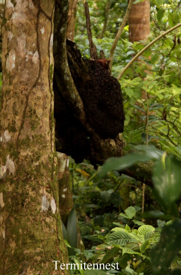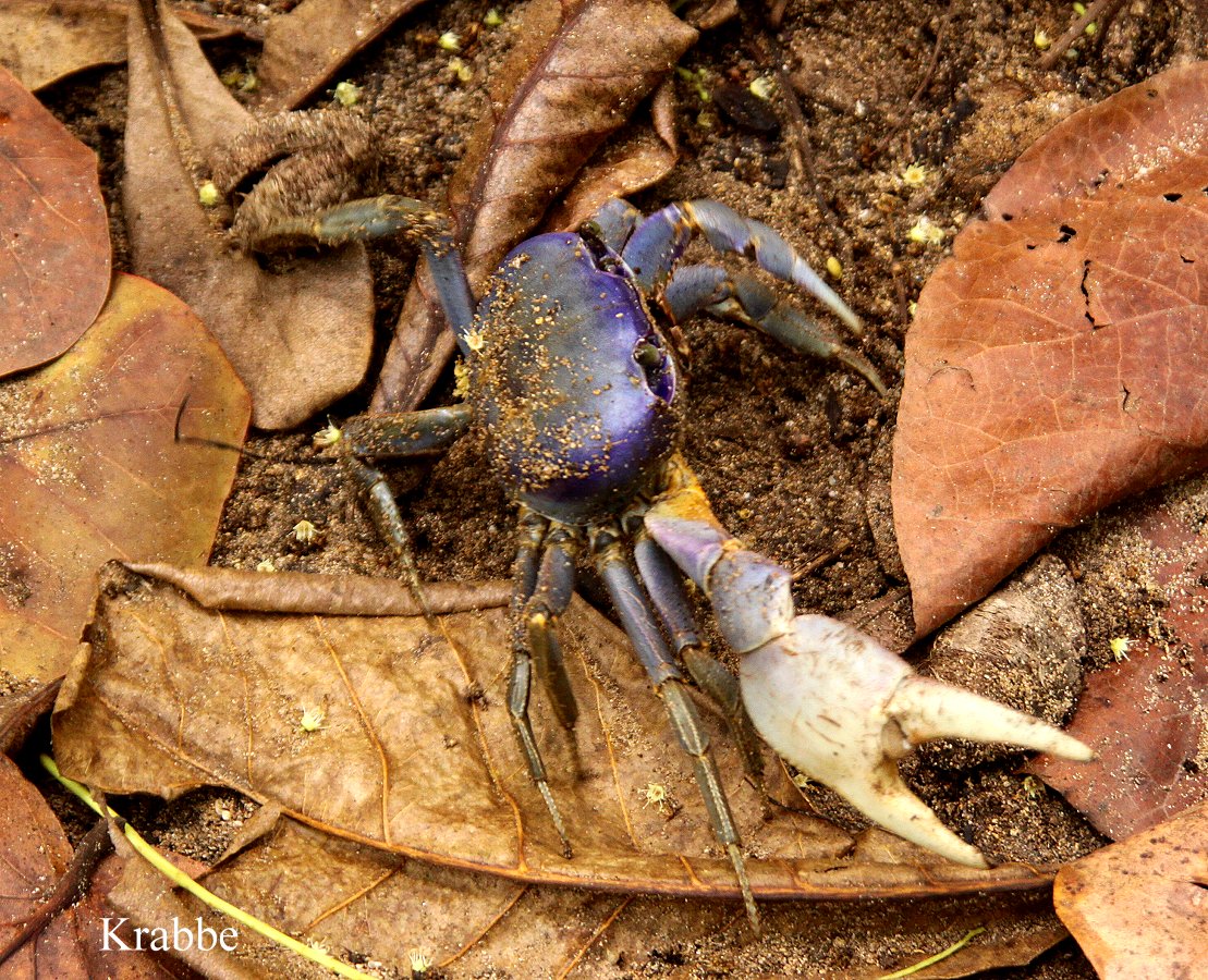 Zahlreiche Pflanzen mit fleischigen Blättern und roten Blüten (Red Ginger) standen am Weg, sowie auch andere exotische Arten. Auch trafen wir immer wieder auf Termitennester an einzelnen Baumstämmen. Eine blaue Krabbe lief uns über den Weg, die leider ziemlich angeschlagen aussah. |