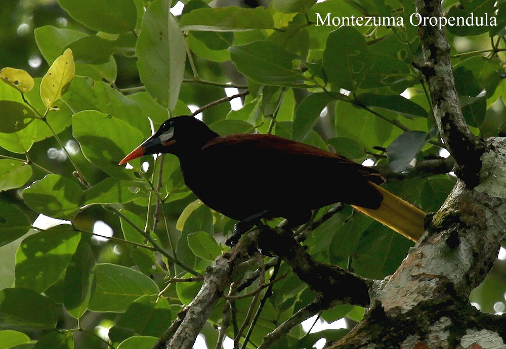 Bei einer Bank besorgte ich mir noch etwas Bargeld und schon ging es los auf die etwa 210 km lange Strecke zur Selva Verde Lodge bei Puerto Viejo de Sarapiqui. Gegen 9:00 h kurz vor Limon entdeckten wir in einem dichten Waldstück mit hohen Bäumen eine große Schar von schwarzen Vögeln mit gelben Schwanzflecken. Mit Hilfe unseres Vogelbuches identifizierten wir die Vögel als Montezuma Oropendula. Es waren mindestens 20 Stück. |