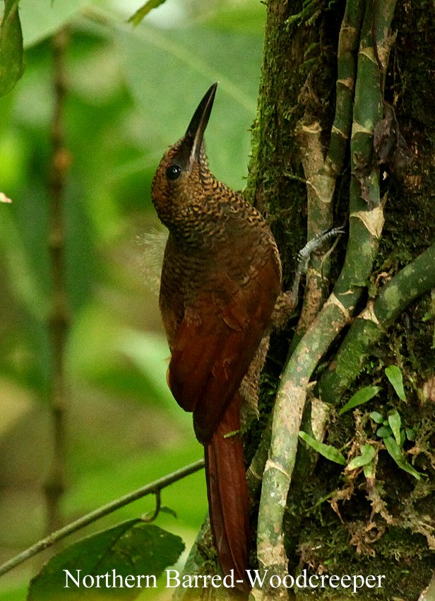 Da wir Hunger hatten, aßen wir das Gebäck, das wir schon gestern gekauft hatten. Ein kleines süßes Gebäckstück nahm ich mit zum nahen Restaurant, wo es für Gäste kostenlos Kaffee und Tee gab. Als ich zurückkam, stand Tomoko gerade unter den Bungalows, die ja auf hohen Stelzen gebaut sind, und fotografierte zwei große Iguanas, die sie gerade dort entdeckt hatte. Auch einen Great Kiskadee sowie einen Specht (Northern Barred-Woodcreeper) hatte sie fotografiert. |
