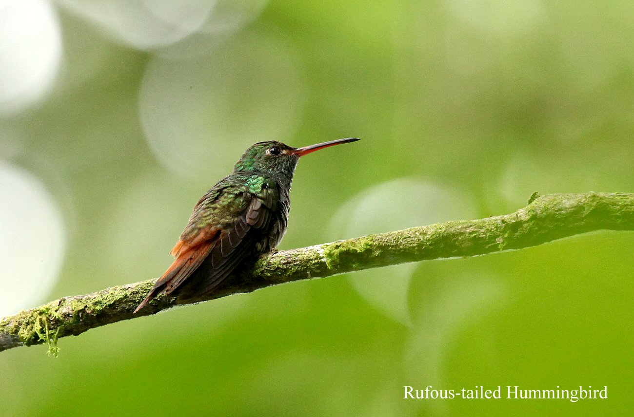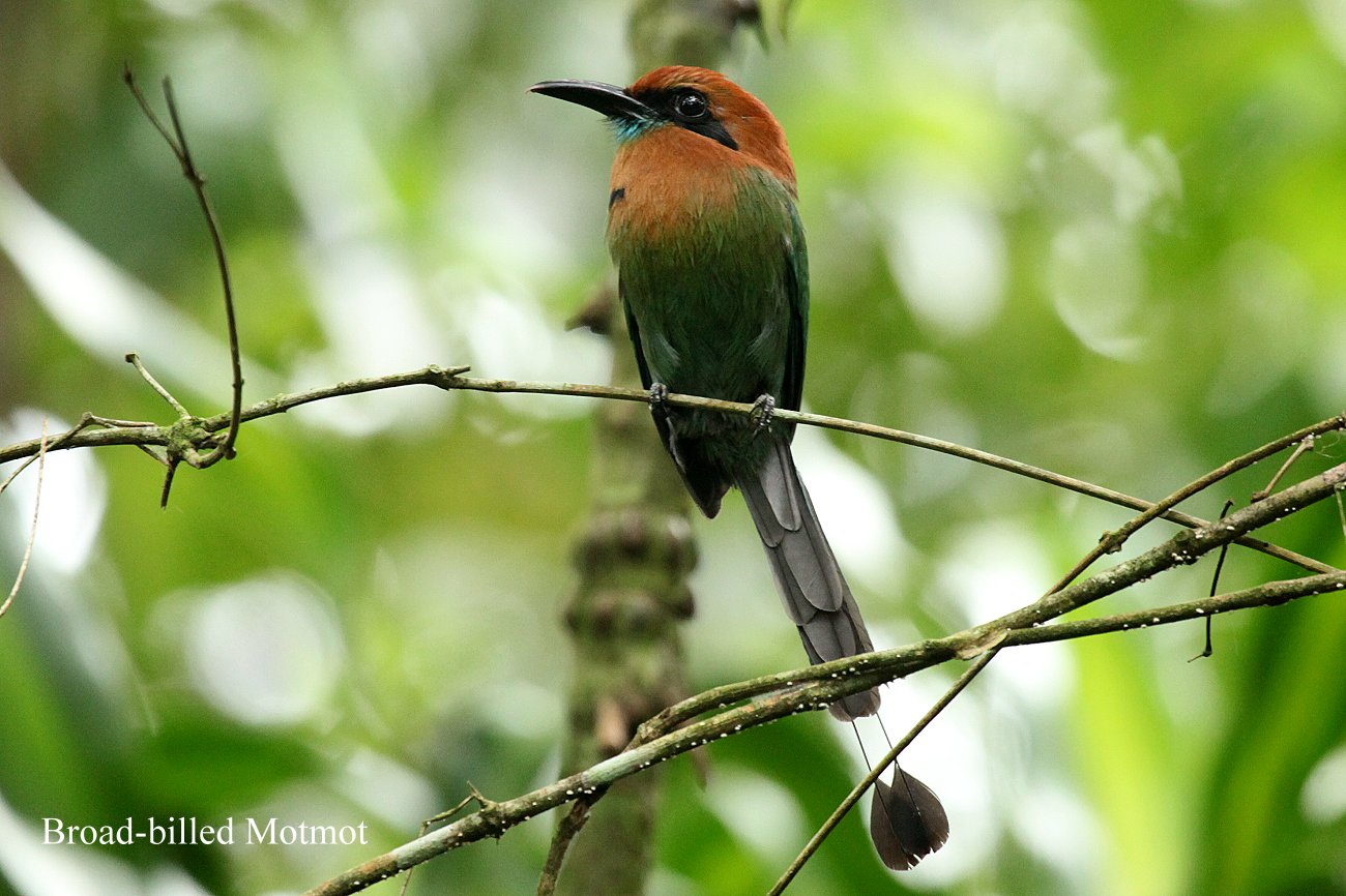 Da es plötzlich leicht zu regnen anfing, gingen wir schnell zurück. Bei dem überdachten Weg angekommen entdeckte ich einen Robin und gleich darauf einen heranfliegenden weiteren Vogel, der auf einem Ast sitzen blieb. Es war ein wunderschöner Broad- billed Motmot mit zwei langen Schwanzfedern. |