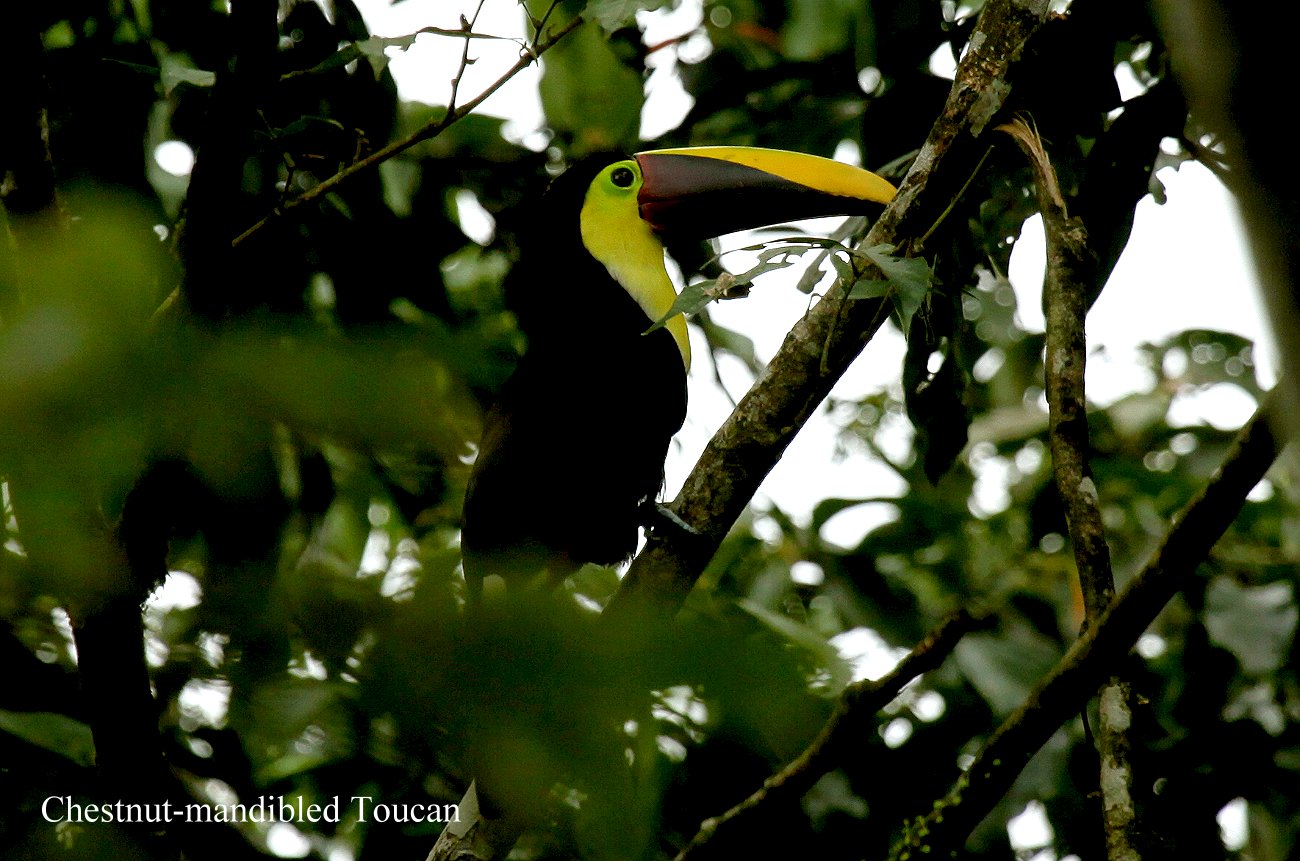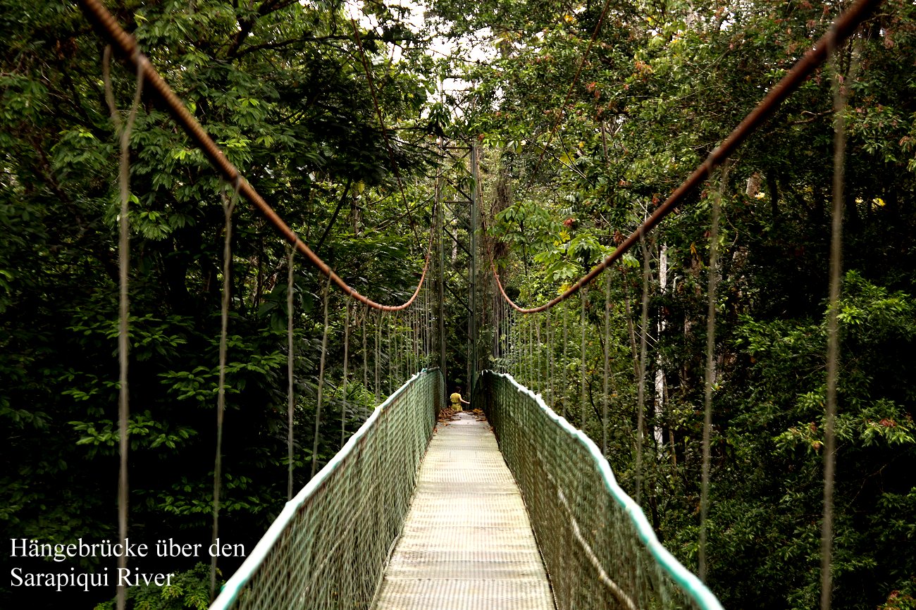 Als ich Tomoko von der Möglichkeit erzählte, im Restaurant Kaffee zu trinken, machten wir uns beide nochmal auf den Weg dorthin. Nach dem Kaffee gingen wir mal auf die Hängebrücke, die hier über den Rio Sarapiqui gespannt ist. Die Konstruktion ist ziemlich schwankend und Tomoko bekam schon Angst. Da kam ein großer Vogel herangeflogen und blieb auf einem nahen Baum sitzen. Es war ein prächtiger Chestnut-mandibled Toucan, den wir zum ersten Mal sahen. |