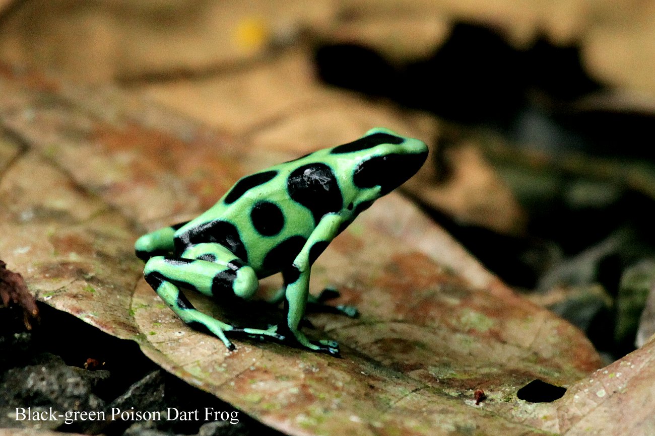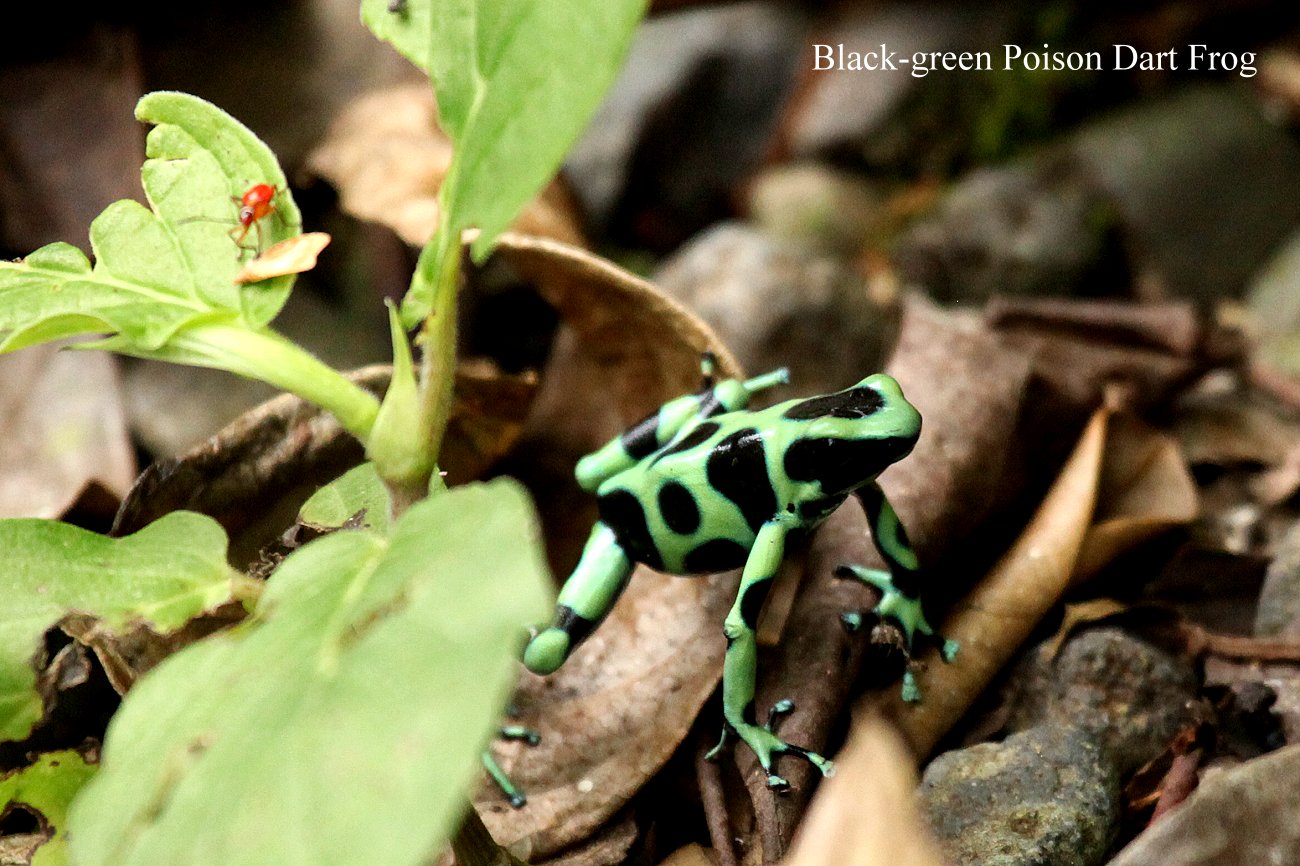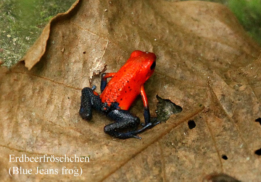 Da jetzt am fortgeschrittenen Nachmittag sich die ersten Moskitos zeigten, gingen wir ins Zimmer zurück, wo Tomoko sich mit Nobite, einem Moskitoschutzmittel, einrieb. Mir taten die Knie etwas weh. Deshalb setzte ich mich in einen Sessel auf unsere Veranda und beobachtete die Umgebung bequem von dort aus. Etwas später ging ich ins Zimmer und begann schon mal mit Tagebuch schreiben. Tomoko ging nochmal für ein Stündchen los. Dabei sah sie einen weiteren Motmot (Broad-billed Motmot) sowie mehrere winzige rote Erdbeerfröschchen (Strawberry Poison-dart Frog), die wegen ihrer blau-schwarzen Beine auch "Blue-Jeans-Frog" genannt werden. Nach ihrer Schilderung waren die höchstens 2 cm groß. |
