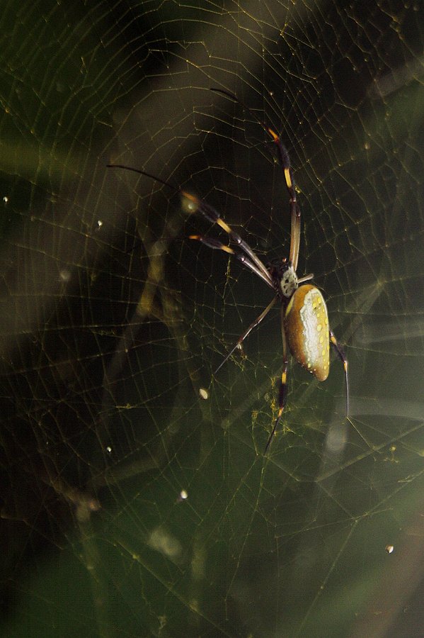 Auf dem Rückweg von der Rezeption entdeckte ich plötzlich zwei kleine Frösche auf dem Pfad. Es waren wunderschöne, aber giftige Pfeilgift-Frösche (Goldbaumsteiger), knapp 3 - 4 cm groß. Goldbaumsteiger betreiben Brutpflege, indem das Männchen jeweils eine geschlüpfte Kaulquappe auf den Rücken nimmt und sie anschließend in wassergefüllten Blattachseln von Bromelien absetzt, die sich etwa zwei bis drei Meter über dem Erdboden befinden (Wikipedia). Auch eine dicke Spinne saß in ihrem Netz und wartete auf Beute. |