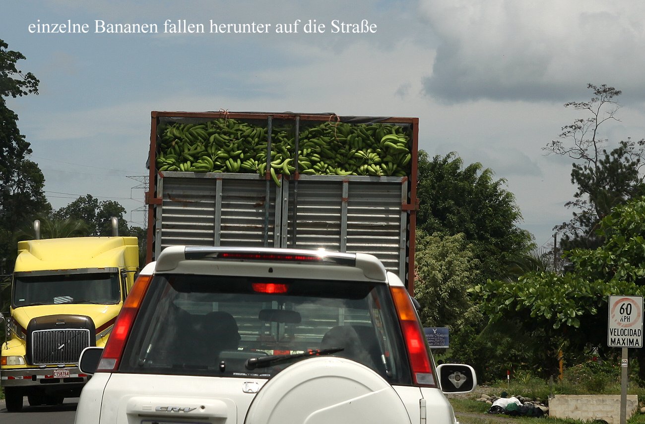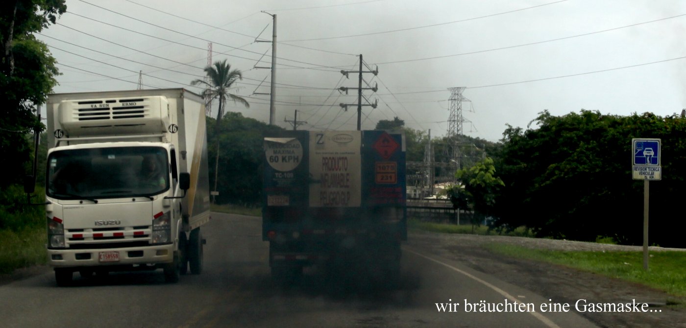 Bei Limon passierten wir wieder die großen Containerstapel. Heute war aber deutlich weniger Verkehr als vor drei Tagen. Trotzdem behinderten immer wieder langsame Fahrzeuge das zügige Weiterkommen. |