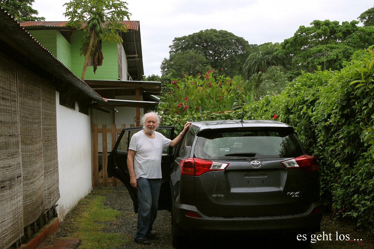 Die ganze Nacht regnete es Sturzbäche vom Himmel. Als wir aber gegen 5:45 h wach wurden, hatte der Regen aufgehört. Das Dach des Bungalows hatte dem starken Regen wohl nicht ganz Stand gehalten, denn am Boden zeigte sich eine kleine Pfütze und Tomokos Rucksack war nass geworden. Um 6:00 h standen wir auf und packten die Koffer. Um 7:00 h hatten wir alles im Auto verstaut und fuhren zu einem nahen Café um dort Kaffee zu trinken. Das Frühstück dort war sehr gut und mit 9300 Colones (ca. 12,- €) auch ziemlich preiswert. Wir blieben gemütlich sitzen bis 8:00 h. |