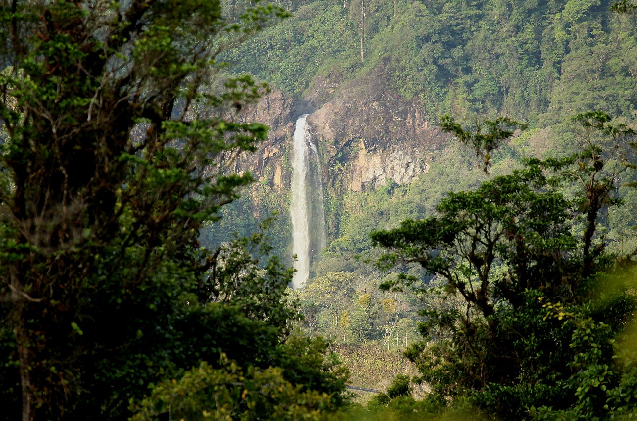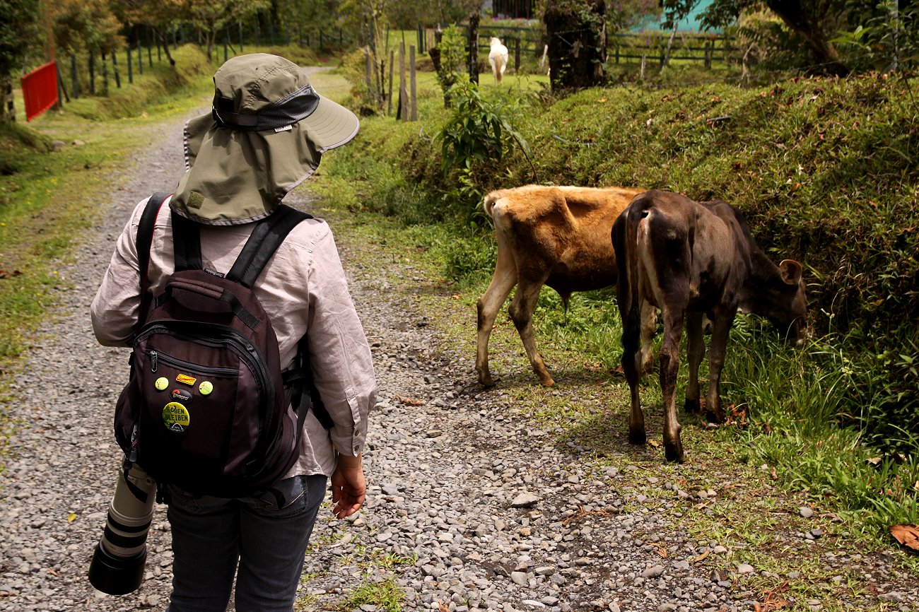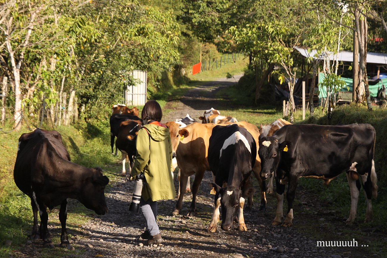 Die zwischenzeitlich aufgezogenen Wolken zogen ab und die Sonne kam hervor. Dadurch leuchtete plötzlich die ganze Umgebung in kräftigen Farben und auch der Vulkan Poás war gut zu sehen. An einer Stelle hatten wir einen schönen Ausblick auf einen Wasserfall in der Ferne. Eine Kuhherde kam uns auf dem schmalen Weg entgegen. Die Kühe waren friedlich, ließen sich aber nicht streicheln. |