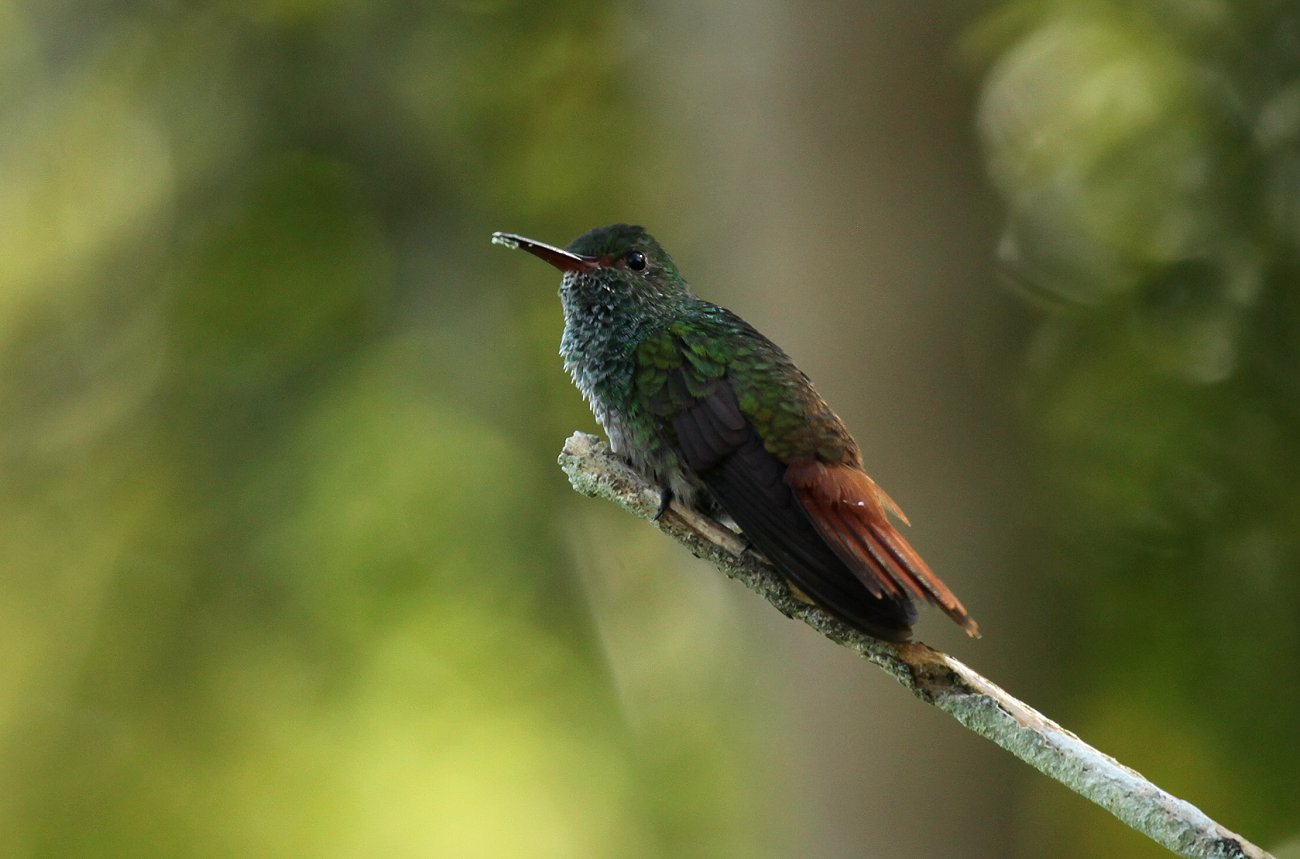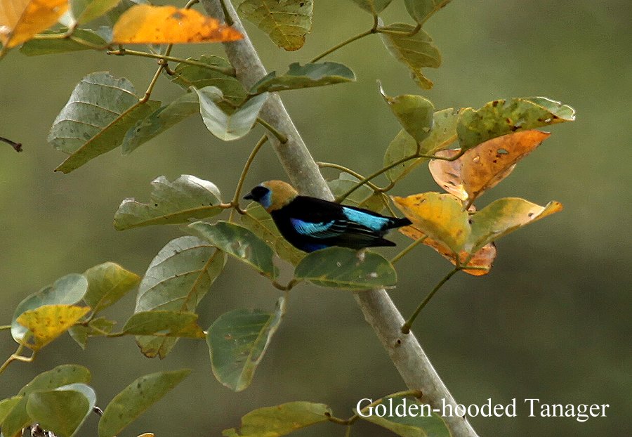 Gegen 4:00 h beim ersten Hahnenschrei wurde ich wach. Draußen war es noch dunkel, somit blieb ich einfach liegen bis die Dämmerung gegen 5:00 h einsetzte. Einige Brüllaffen hörte man aus weiter Entfernung sowie zahlreiche Vogelstimmen. Das Wetter war gut, über uns klarer Himmel, an dem die letzten Sterne gerade verblassten. Die gegenüberliegenden Berggipfel waren in Wolken gehüllt. Bis zum Frühstück um 7:00 h machten wir eine kleine Wanderung in die nähere Umgebung. Gleich am Eingang zur Lodge landete ein Falke hoch auf einem Baum. Ein Blue-gray Tanager suchte in den Zweigen der Büsche emsig nach Futter. |