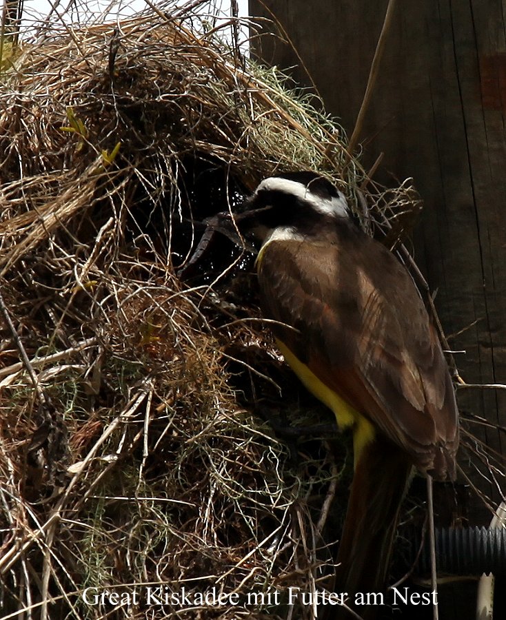 Ein Great Kiskadee hatte eine Libelle gefangen und flog damit zu seinem Nest an einem Strommast um seine Jungen zu füttern. Immer wieder flatterten auch farbenprächtige Schmetterlinge durch die Blumenwiesen. |