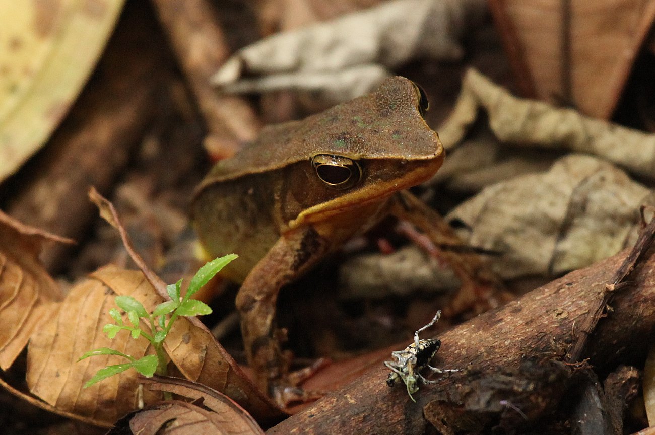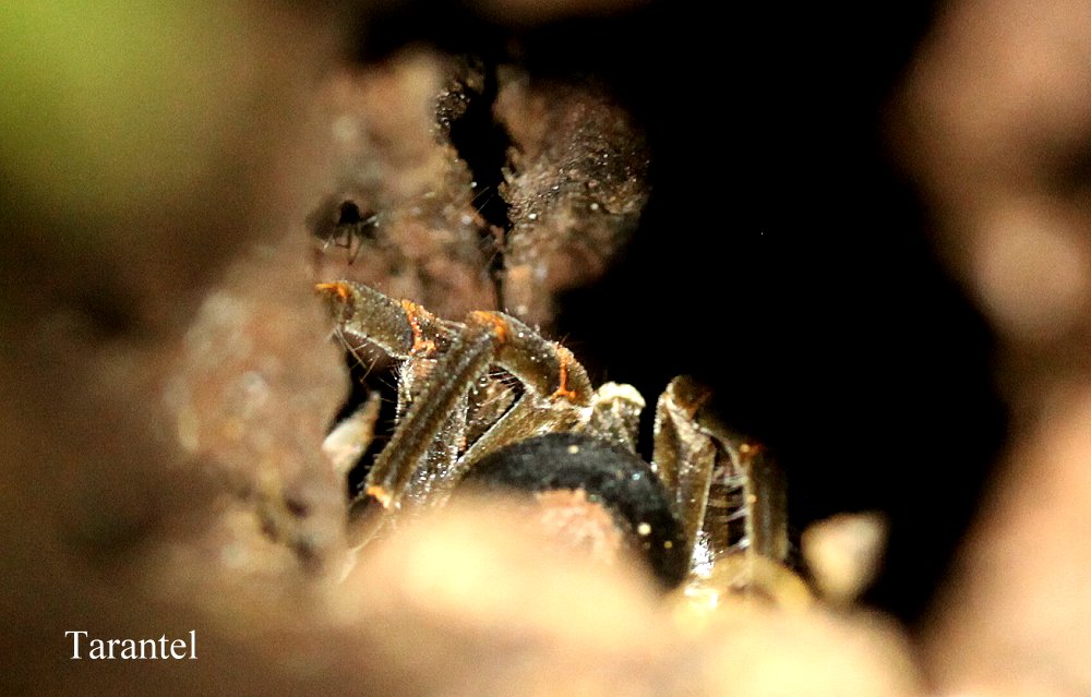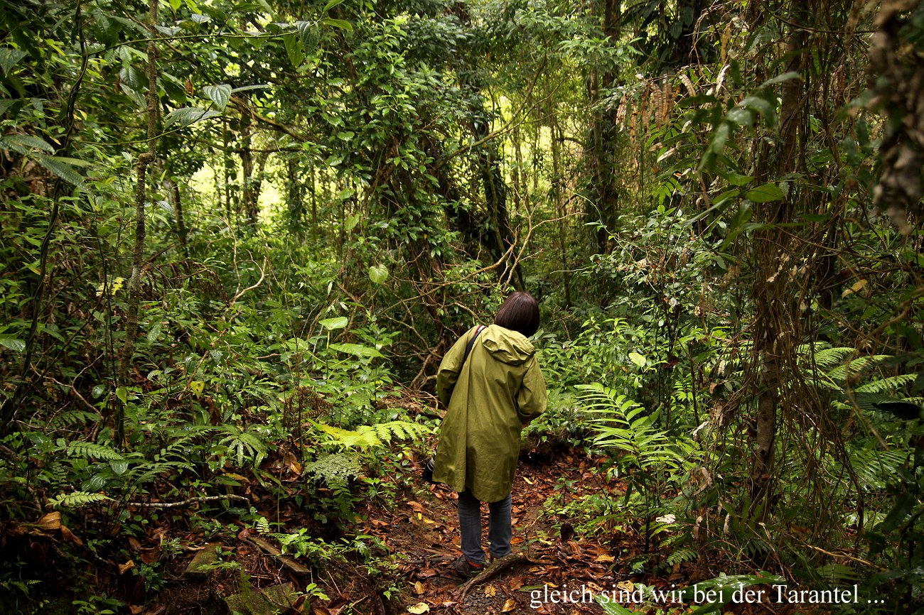 Da ich auch gerne die Tarantel sehen wollte, zeigte Tomoko mir die Stelle, die ein paar hundert Meter entfernt an einem kleinen Trail mitten im Dschungel lag. In einem liegenden morschen Baumstamm konnte man mit einer Taschenlampe in eine kleine Höhle hineinleuchten. Etwa 50 cm tiefer entdeckte ich die Tarantel, von der man nur die haarigen Beine sehen konnte. Das sah schon ziemlich grotesk aus. |