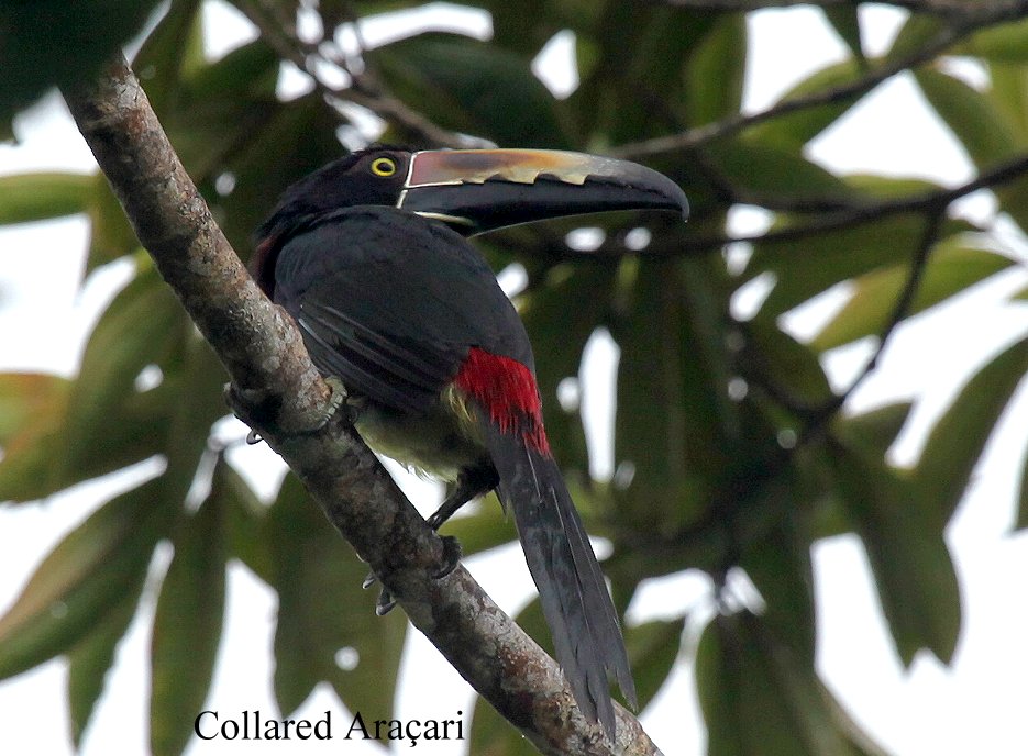 Um kurz vor 12:00 h waren wir wieder zurück bei unserer Hütte. Gerade als mich etwas hingelegt hatte um kurz zu verschnaufen, kam José mit der Meldung, dass das Mittagessen bereit sei. Also gingen wir hinüber ins Restaurant, wo schon wie gewünscht eine leckere Salatplatte bereit stand. Auch eine große Kanne Zitronensaft für den Durst war sehr willkommen. Anschließend bekamen wir noch eine große Kanne Kaffee mit ein paar Plätzchen. Wir verabredeten uns noch für 15:00 h zu einer gemeinsamen Fahrt zu Wasserfällen in der Nähe, bevor ich für ein halbes Stündchen Siesta machte. Währenddessen zeigte José Tomoko eine in einem Astloch verborgene Tarantel. Nachdem ich mich etwas erholt hatte, duschten wir beide mal, was wir heute morgen nicht geschafft hatten. So erfrischt schrieb ich weiter Tagebuch und Tomoko versuchte an Hand ihres Sprachführers ihre Spanisch-Kenntnisse zu erweitern. Gegen 15:00 h fing es leicht an zu regnen, weswegen wir den geplanten Ausflug zum Wasserfall auf morgen früh verschoben. Stattdessen blieben wir auf unserer Terrasse sitzen, sortierten Fotos und lernten beide etwas spanisch. Irgendwann hörte der Regen wieder auf. Plötzlich tauchten vor unseren Augen zwei Araçaris auf, die kurz in einem Baum verweilten und dann weiterflogen. In einiger Entfernung ließ sich auch mehrfach ein Tukan (Keel-billed Toucan) blicken |