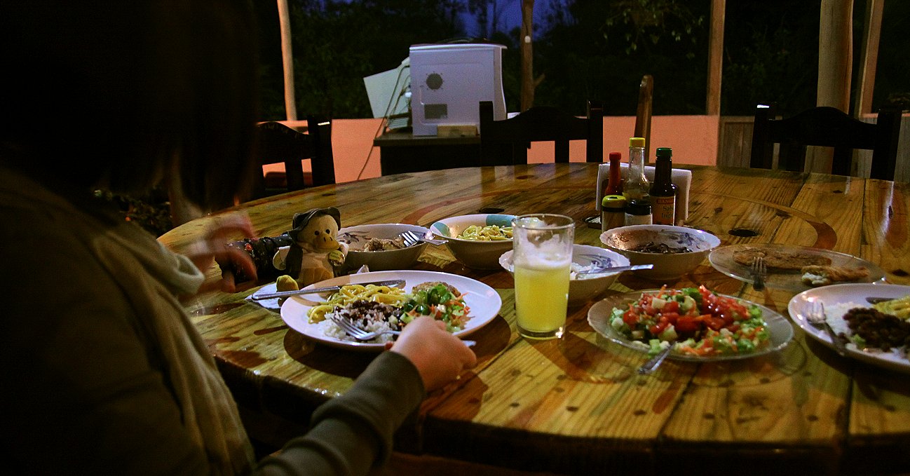 Wir wanderten noch ein wenig umher, doch das Licht wurde zum Fotografieren immer schlechter, da einige Nebelschwaden über uns hinwegzogen. Also gingen wir zur Hütte zurück. Um 19:00 h gab es Abendessen, wieder ganz schmackhaft zubereitet. Ich bekam gebratenes Fischfilet mit Reis und Bohnen sowie Pasta in Kokusnuss-Curry-Sauce. Tomoko erhielt statt des Fisches ein unbekanntes gebratenes Gemüse, das aber sehr gut schmeckte. Dazu gab es eine gemischte Salatplatte und zu trinken Ananassaft, alles sehr, sehr lecker... Da wir die einzigen Gäste sind, wurde alles ausschließlich für uns beide gekocht, wunderbar... |