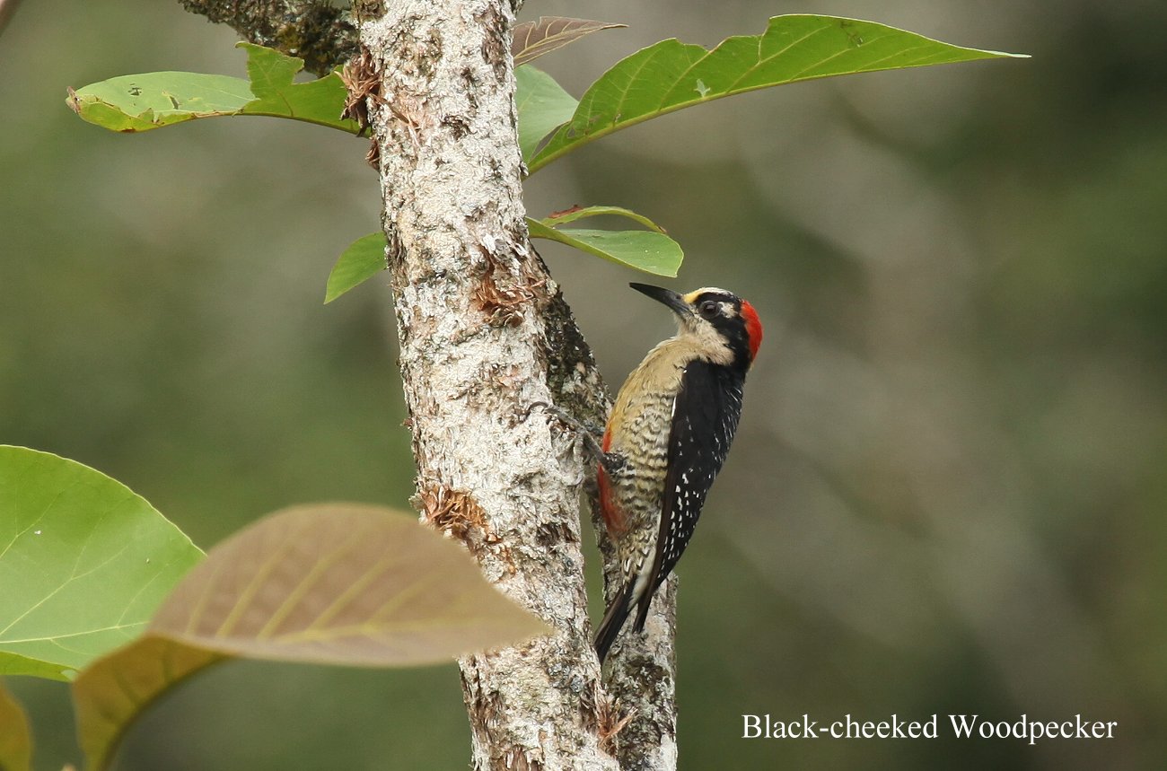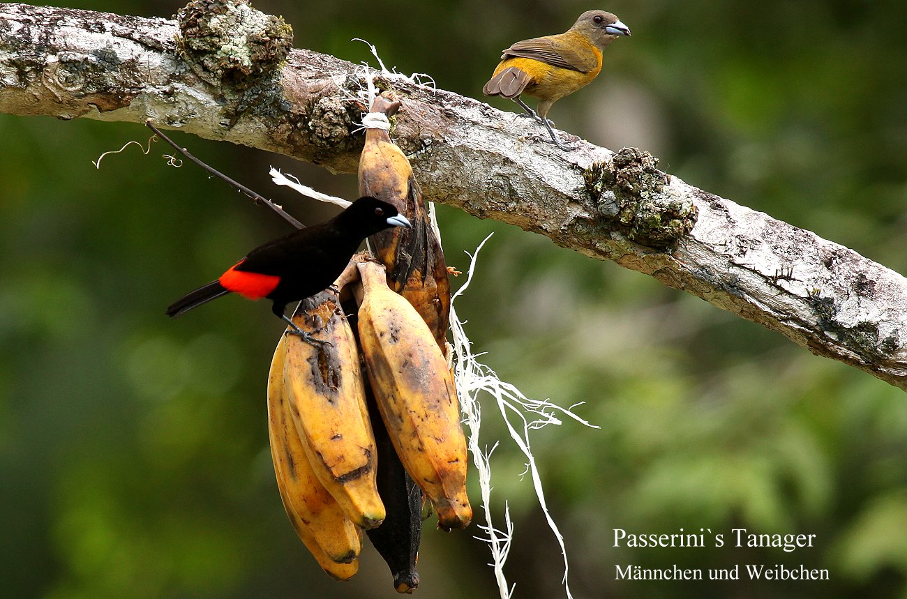 Von der Terrasse des Zimmers hatte man einen herrlichen Blick auf die Lagune und den Urwald. Zahlreiche bunte Vögel flogen heran und pickten an aufgehängten Bananen. Tomoko rannte gleich mit ihrer Kamera los, während ich das Gepäck aus dem Auto ins Zimmer beförderte. Es war mit jetzt 33° hier im Flachland ganz schön heiß geworden, nach der doch eher gemäßigten Temperatur auf 1000 m Höhe. Während ich von der Terrasse unseres Zimmers noch die bunten Vögel auf den Bananen beobachtete, kam Tomoko aufgeregt zurück. Sie hatte die zwar hier vorkommenden, aber nicht immer zu sehenden großen grünen Papageien (Great green Macaw) in einiger Entfernung gesehen und sogar ein Belegfoto machen können. Auch einen Oriole (Black-cowled Oriole) konnte sie fotografieren. |