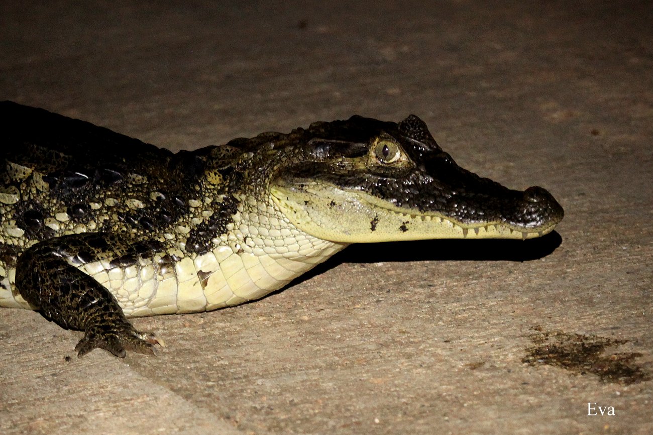 Nach dem Essen versammelten sich die 8 Gäste der Lodge, alle Deutsch sprechend , zu einem kleinen Nachtspaziergang den Weg zur Lagune hinunter. Unser Führer Henri rief in die Dunkelheit verschiedene Namen wie „Eva“, „Aggressivo“, „Mama Hässlich“ usw. und plötzlich kamen von verschiedenen Seiten Kaimane aus den Sümpfen den Weg hinauf uns entgegen gekrochen. Ihre Augen leuchteten gespenstig im Licht der Taschenlampen. |