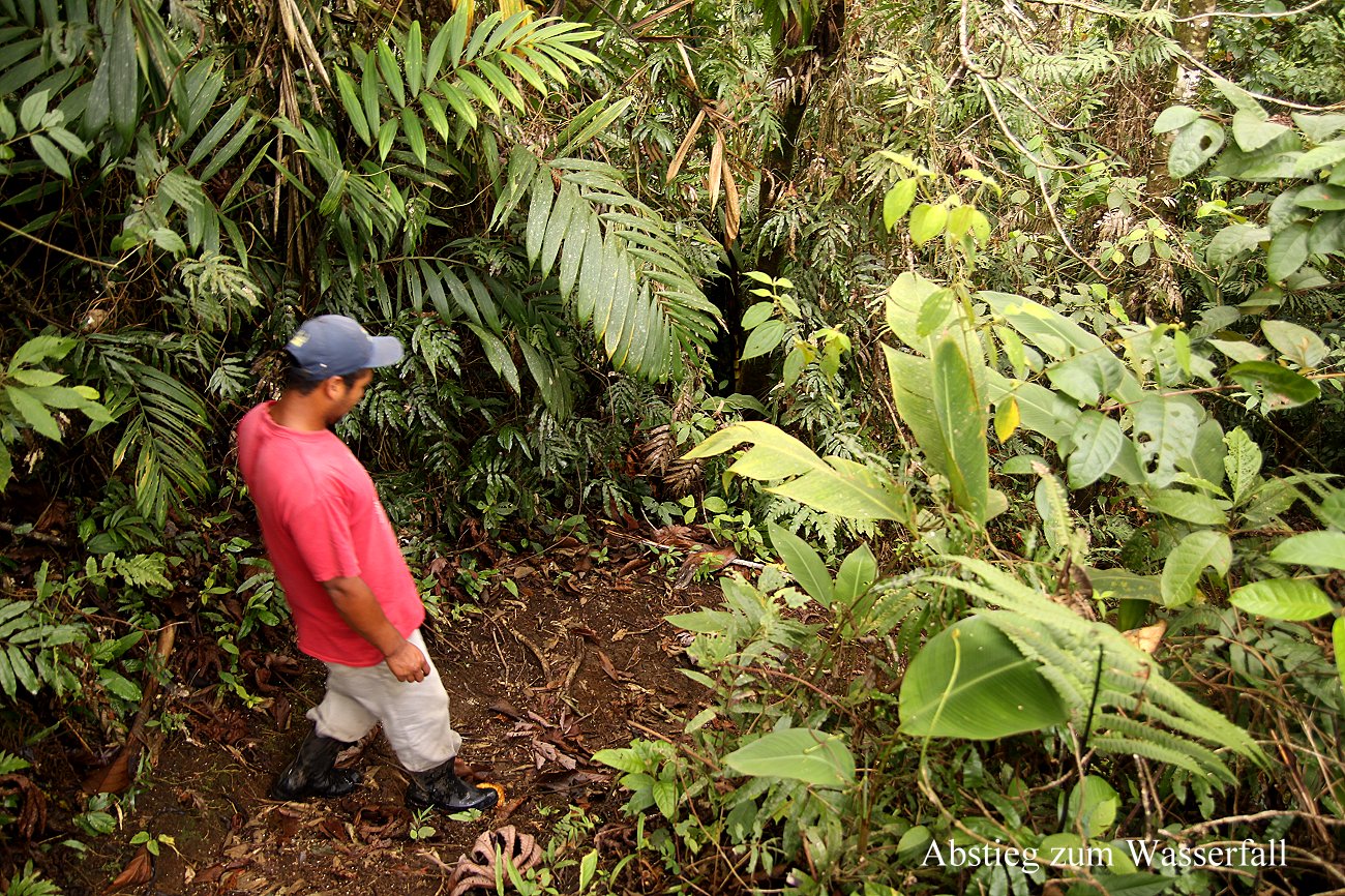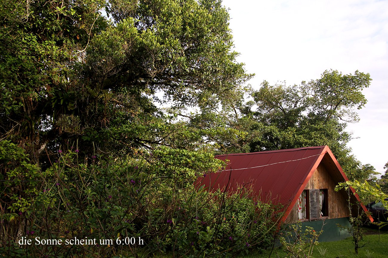 Um 3:50 h hörte ich den ersten Hahn krähen. Ich schlief aber noch mal ein. Beide wurden wir um 5:10 h wach. Aus der Ferne hörten wir einige Brüllaffen rufen, auch etliche Vögel zwitscherten schon. Also standen wir auf und machten gegen 5:30 h einen ersten Spaziergang. Der Himmel war bewölkt, doch es war trocken. Die Temperatur betrug 20° bei 94% Luftfeuchtigkeit, recht angenehm. Auf dem kleinen Weg vor der Lodge sahen wir José schon bei der Arbeit, Ziegen und Kühe versorgen. Auch zahlreiche Vögel konnten wir wieder sehen. |