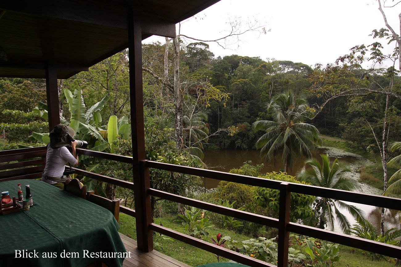 Wir gingen zur Rezeption, wo Kurt, ein Deutscher, dem die Anlage gehört, uns begrüßte und uns einiges Wissenswerte rund um die Lodge erklärte. Mit einem Kaffee setzte ich mich auf die große Terrasse. Auch hier waren Bananen für die Vögel aufgehängt. Was hier innerhalb kurzer Zeit an Vögeln , einer schöner als der andere, zu sehen war, war einfach unbeschreiblich. Wir wussten gar nicht, wohin wir zuerst schauen sollten, soviel war zu sehen. |