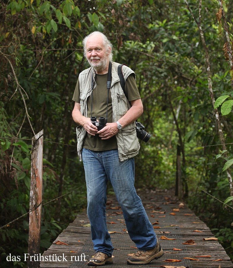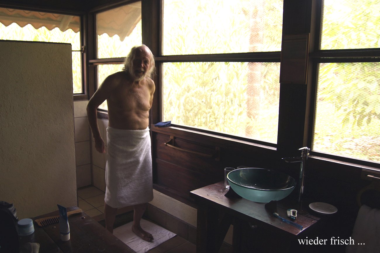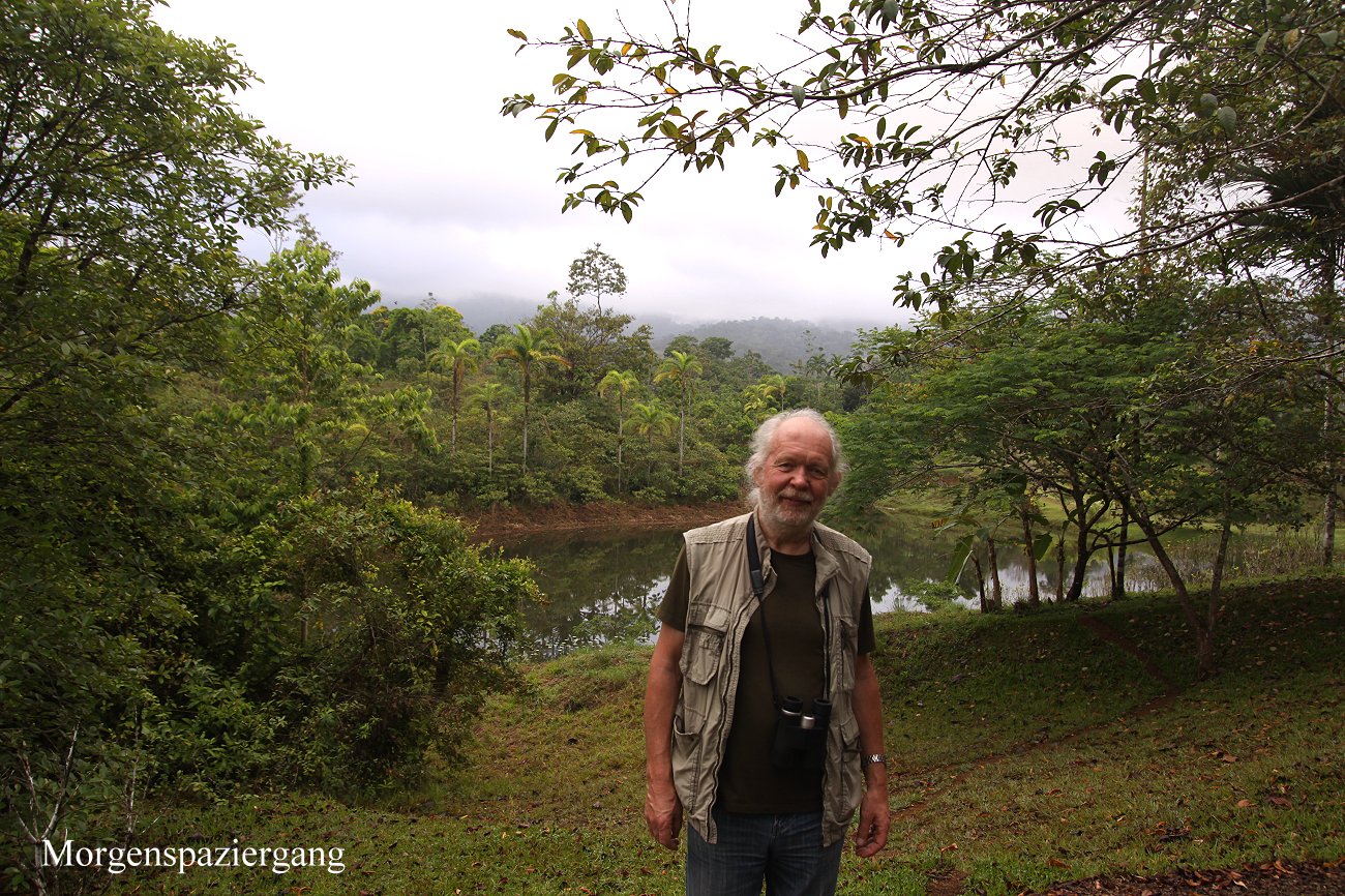 Um 5:30 h wurden wir wach. In der Nacht blieb es trocken und als wir aus dem Fenster schauten, sah das Wetter ganz passabel aus. Also blieben wir nicht lange liegen, sondern nahmen Fernglas und Fotoapparat in die Hand und machten gegen 6:00 h einen kleinen Spaziergang, diesmal in Richtung des Trails, den wir gestern bei der Führung genommen hatten. Einer der Hunde Pablos folgte uns. Wir befürchteten schon, dass der Hund wohl alle Vögel vertreiben würde. Das war aber nicht der Fall , im Gegenteil, der Hund trottete brav mit uns daher und ließ sich von Tomoko und mir immer wieder streicheln. |