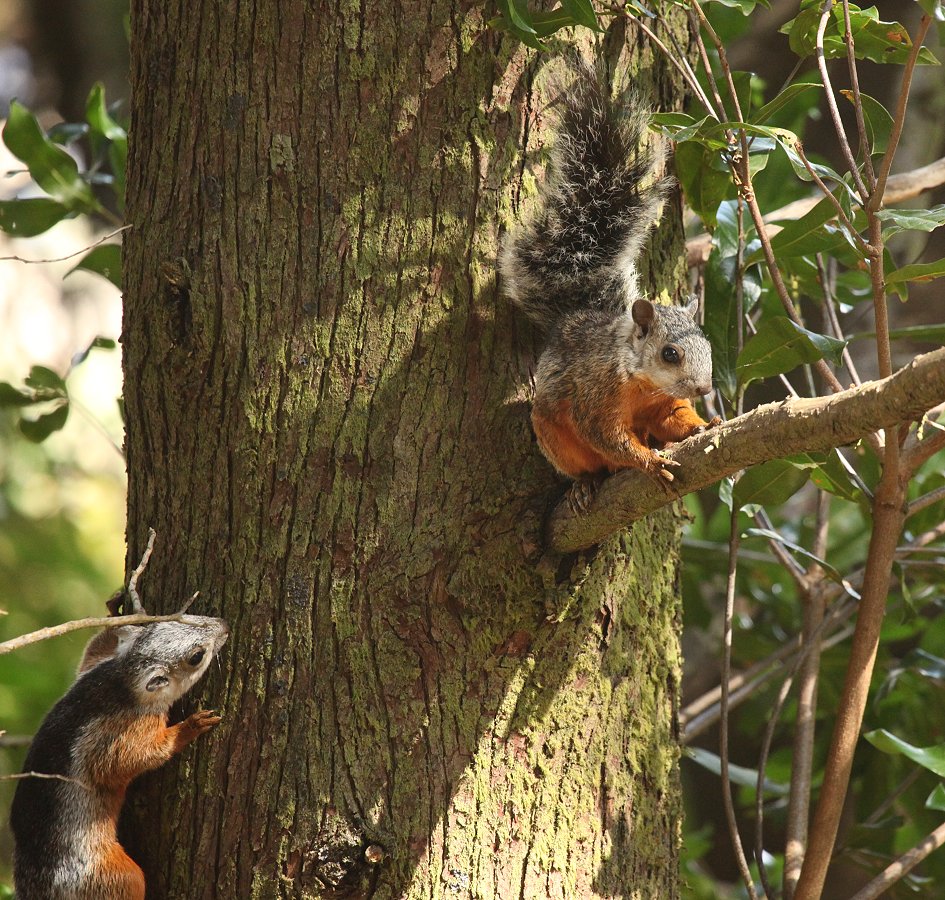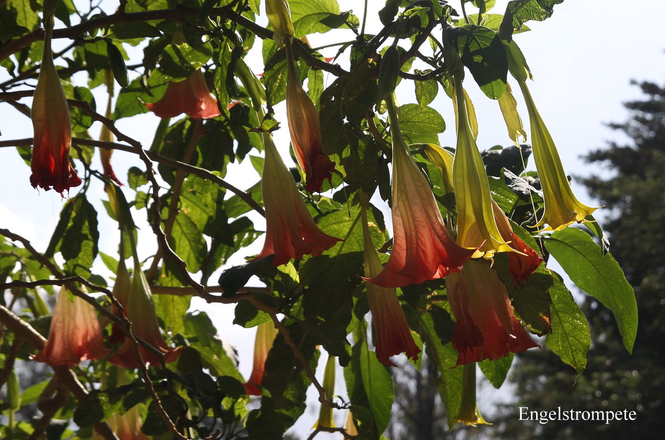 Zwei Eichhörnchen turnten durch die Pinien. Einige Bäume trugen prächtige Blüten , darunter waren auch einige Engelstrompeten. |