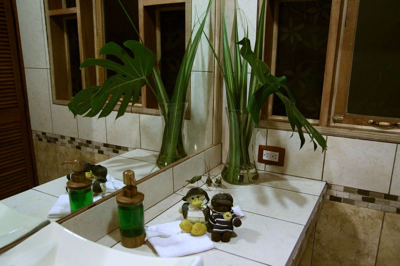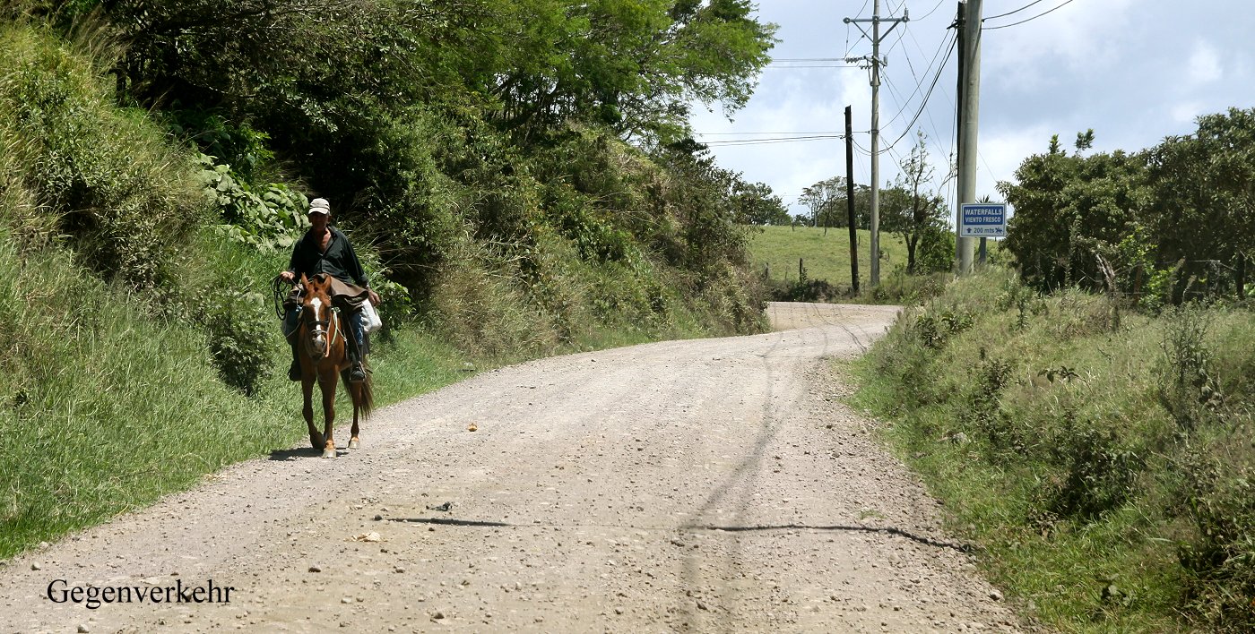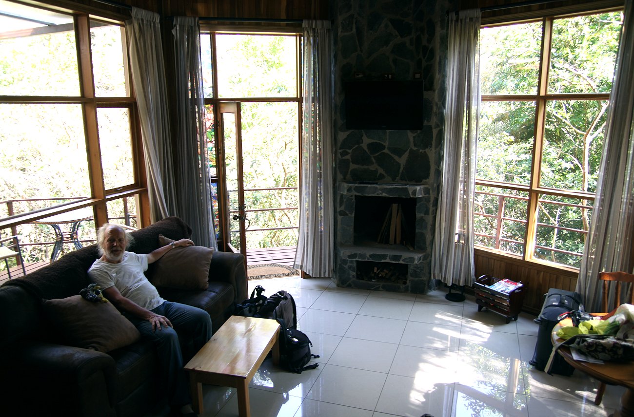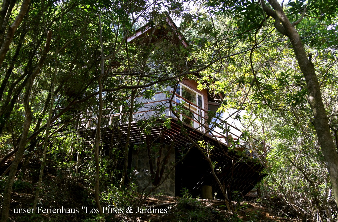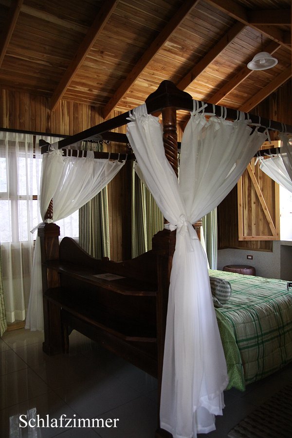 Weiter ging es mit der Rüttelei. Kurz nach 14:00 h erreichten wir Santa Elena auf 1.400 m Höhe. Die Straße hier war wieder asphaltiert, aber der Ort machte einen furchtbar touristischen Eindruck auf uns. Langsam fuhren wir an zahlreichen kleinen Bars, Souvenirläden, Hotels, Backpacker-Unterkünften vorbei auf der Suche nach unserem Hotel. Das hatte ich wohlweislich im Internet schon lange ausgesucht und im voraus gebucht, außerhalb von Santa Elena in Richtung Monteverde liegend. Als wir die Einfahrt zum Hotel erreichten, wurde die Umgebung schlagartig schöner. Die Hotelanlage liegt etwas abgelegen in einem ruhigen Pinienwald. Bei der Rezeption erwartete uns eine freundliche junge Dame, die uns zu unserem Zimmer mit einem kleinen Quad-Bike vorausfuhr. Ich hatte ja schon einiges im Internet über die Unterkunft „Los Pinos & Jardines“ gelesen, doch was wir vorfanden übertraf all unsere Erwartungen. Unser Zimmer 17, das höchste am Berg, entpuppte sich als kleines Wohnhaus mit Wohnraum, Schlafzimmer, Küche, Bad mit separater Toilette, wie man es sich schöner nicht vorstellen kann. Dieses Gebäude ist ganz neu, innen alles aus Holz und äußerst geschmackvoll eingerichtet. Ich habe schon viele Hotelzimmer auf meinen zahlreichen Konzert- und Privatreisen gesehen, aber dieses, ich muss sagen Haus, gehört zu den schönsten Unterkünften, in denen ich in meinem Leben auf Reisen übernachtet habe. Wir freuen uns sehr, hier 4 Nächte bleiben zu können. |