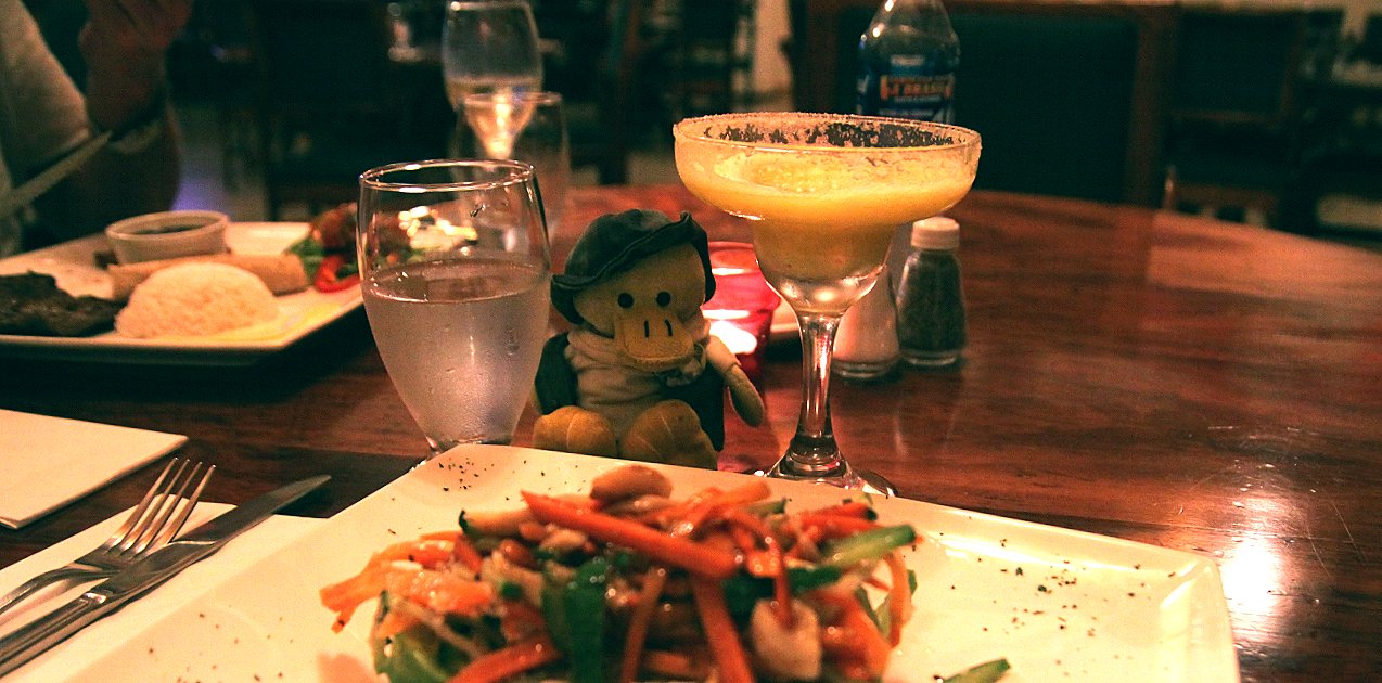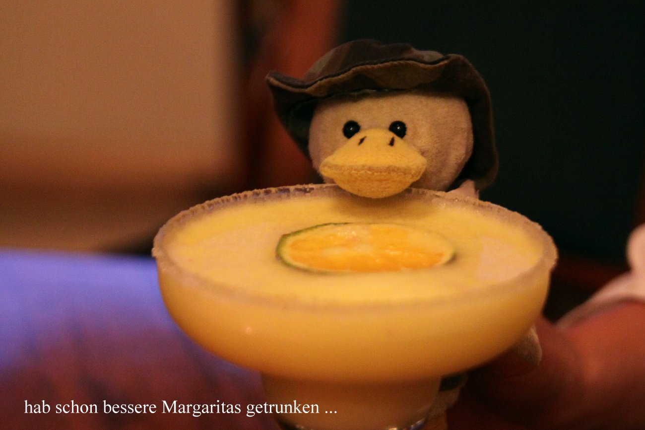 Auf der Rückfahrt überquerte in einer Kurve plötzlich ein mardergroßes Tier, ein Aguti, den Fahrweg, verschwand aber schnell wieder im Dschungel. Dichte Nebelschwaden zogen über uns hinweg und es wurde merklich kühler. Doch es blieb trocken. Wir hatten jetzt mächtig Hunger und hielten direkt beim Restaurant „Don Luis“, das man uns bei der Rezeption empfohlen hatte. Hier aßen wir zu Abend, Tomoko wie immer vegetarisch, ich ein Casado Lomito, beides sehr lecker. Dazu trank ich ein Glas chilenischen Chardonnay. Tomoko hatte für sich einen Mango-Margarita bestellt, der aber etwas komisch schmeckte. |