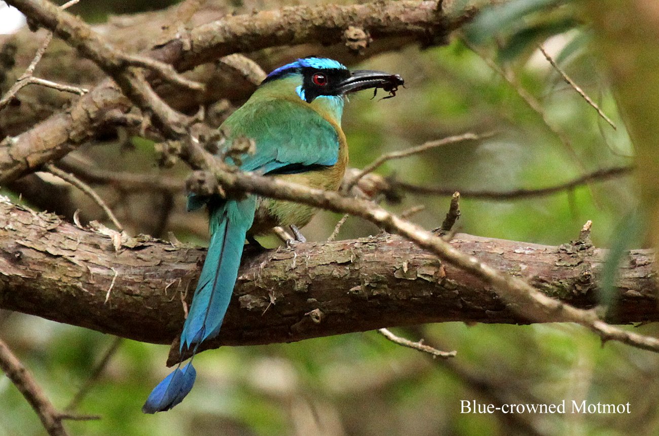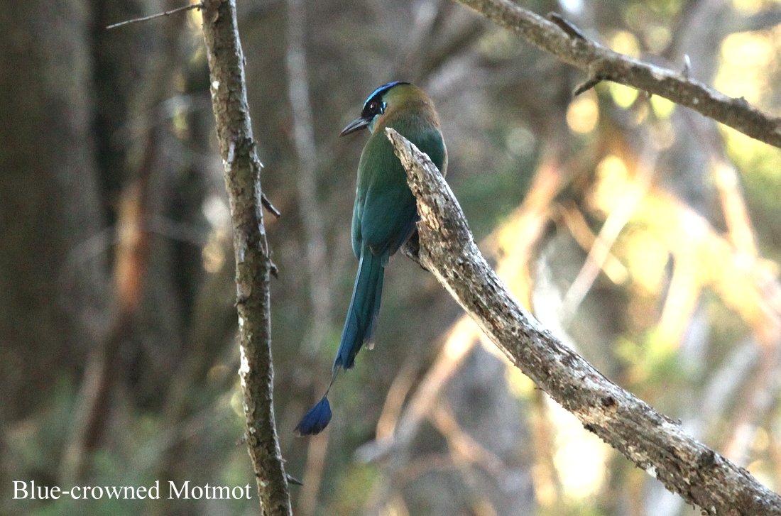 Währenddessen flatterten in den nahen Büschen und am Boden immer wieder Vögel herum, u.a. auch wieder der wunderschöne Blue-crowned Motmot. |