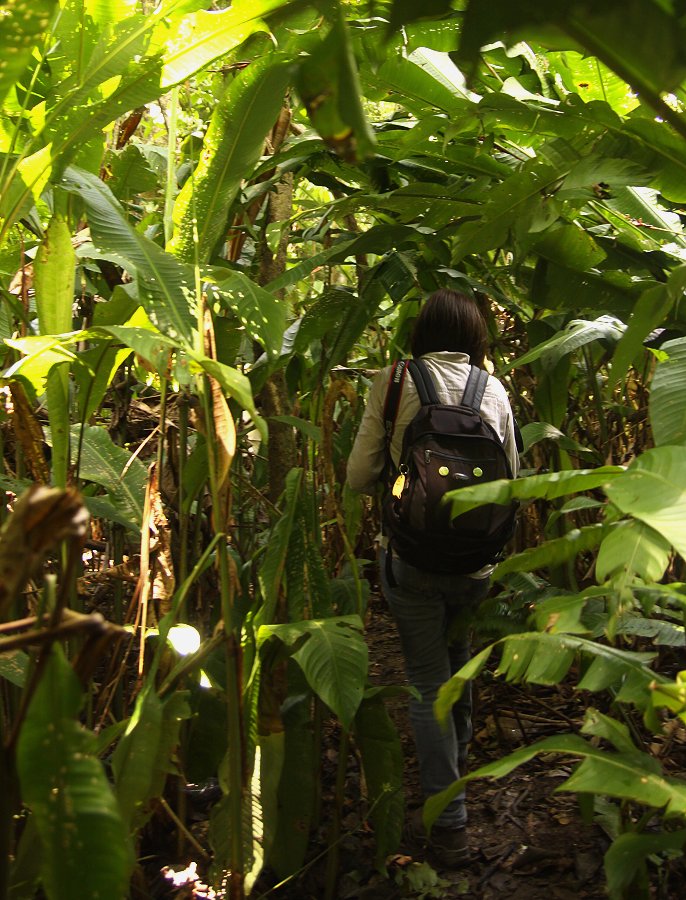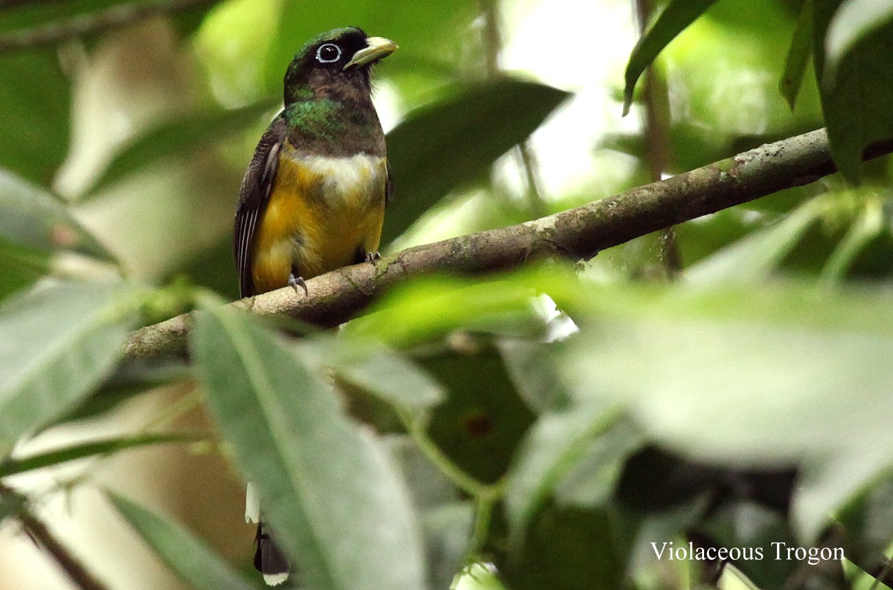 Tomoko hatte ihren Hut vergessen und nach einiger Zeit fühlte sie erste leichte Anzeichen einer Migräne. Wir hielten aber tapfer rund 4 Stunden durch, wobei wir zuletzt einige kleine Pausen einlegten und Wasser tranken. Auch meine Knie begannen zu schmerzen, gut dass wir mein kleines Stühlchen mitgenommen hatten. Mauricio zeigte uns eine Nachtschwalbe, die unglaublich gut am Boden versteckt war, so dass wir größte Mühe hatten, sie zu erkennen. Einmal folgte ich Mauricio, der einen Vogel suchte, während Tomoko auf dem Stühlchen sitzen blieb. Als wir ergebnislos zu ihr zurückkamen, lächelte Tomoko. Sie hatte inzwischen im Sitzen gesehen, was Mauricio vergeblich gesucht hatte, einen Violaceous Trogon. Dem etwas überheblich wirkenden Mauricio schien das nicht sehr zu gefallen. |