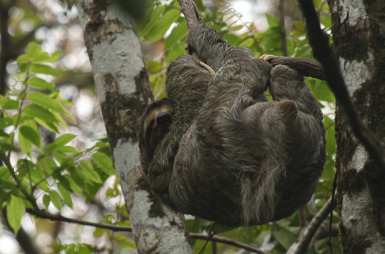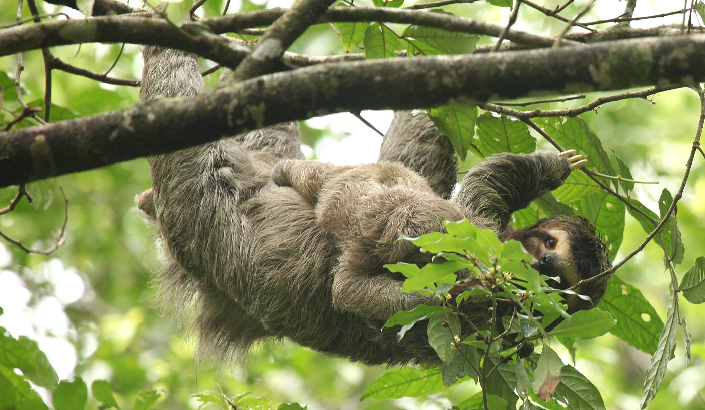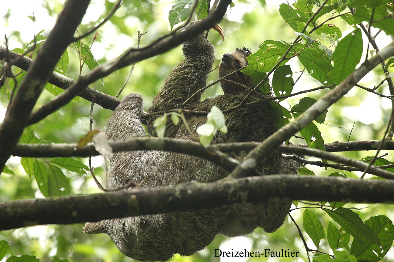 Da sie wieder leichte Krämpfe im Bauch verspürte, suchte sie schnell die hier Gott sei Dank vorhandene Toilette auf. Da es keinen großen Sinn machte unter diesen Umständen noch weiter zu gehen, machten wir uns wieder auf den Rückweg. Dabei konnten wir an zwei verschiedenen Stellen nochmals ein Faultier sehen, wiederum die Art mit den 3 Zehen. Auch einige Kapuziner-Äffchen turnten durch die Baumwipfel. |