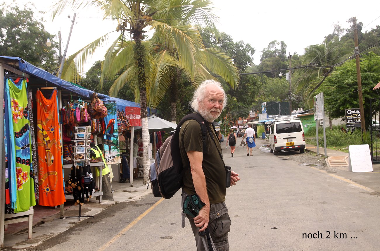 Wir beschlossen erst mal abzuwarten und den Besuch des Manuel Antonio Nationalparks auf später zu verschieben. Der Regen gab uns die willkommene Gelegenheit, mal wieder Emails zu schreiben und etwas im Internet zu surfen. Gegen 9:00 h wurde das Wetter besser und es hörte auf zu regnen. Also packten wir Kameras und Ferngläser zusammen und machten uns mit dem Auto auf Richtung Manuel Antonio Nationalpark. Nach ca. 3 km standen zwei Männer (einer davon uniformiert) auf der Fahrbahn und bedeuteten uns mit ihren Armen zur Seite winkend, dass hier der Parkplatz zum Nationalpark sei. Wir gehorchten brav und zahlten die Parkgebühr von 2.000 Colones (2,60 €). Wir nahmen unsere Sachen aus dem Auto und gingen zu Fuß weiter. Wir gingen und gingen, von einem Eingang zum Park keine Spur, dafür zahlreiche andere Parkplätze, sowie etliche weitere Hotels. Wir mussten so fast 2 km laufen, um endlich den Eingang zu erreichen, so eine Frechheit... Na ja, durch Schaden wird man klug. Zahlreiche Führer boten ihre Dienste an, die wir aber dankend ablehnten. Wir zahlten die Eintrittsgebühr von je 10,- $ und gingen los. Viele Touristen waren unterwegs, viele von ihnen mit Führer. Das war für uns ganz hilfreich, immer wenn eine Gruppe auf dem Weg stehen blieb und der Führer sein Spektiv in die Büsche richtete, gab es was zu sehen. Bei der ersten Stelle sahen wir hoch in den Bäumen ein weibliches Dreizehen-Faultier, das zusammen mit seinem Kind genussvoll aber äußerst langsam frische Blätter verzehrte. Wirklich erstaunlich, mit welcher Langsamkeit diese Tiere sich bewegen. |