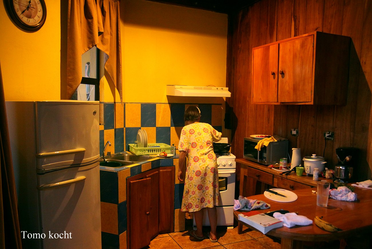 Von unserer Veranda sahen wir in einiger Entfernung 2 Spechte einen trockenen Baum bearbeiten. Auch zwei Tukane (Chestnut mandibled) saßen hoch auf der Spitze eines Baumes. Tomoko fing bald mit Kochen an. Leider funktionierte an dem 4-flammigen Elektroherd nur eine Kochplatte, der Backofen dagegen ließ sich aufheizen. Tomoko grillte einiges Gemüse darin und kochte Pasta auf der funktionierenden Platte. So schaffte sie es ein hervorragend schmeckendes Essen auf den Tisch zu zaubern. Dazu passte ausgezeichnet der Weißwein, von dem wir noch eine 2/3 volle Flasche im Kühlschrank gekühlt hatten. |