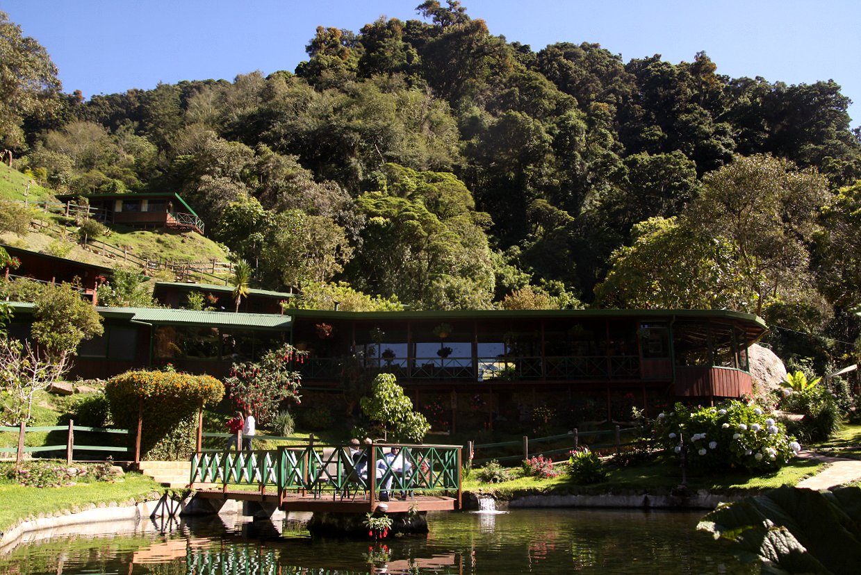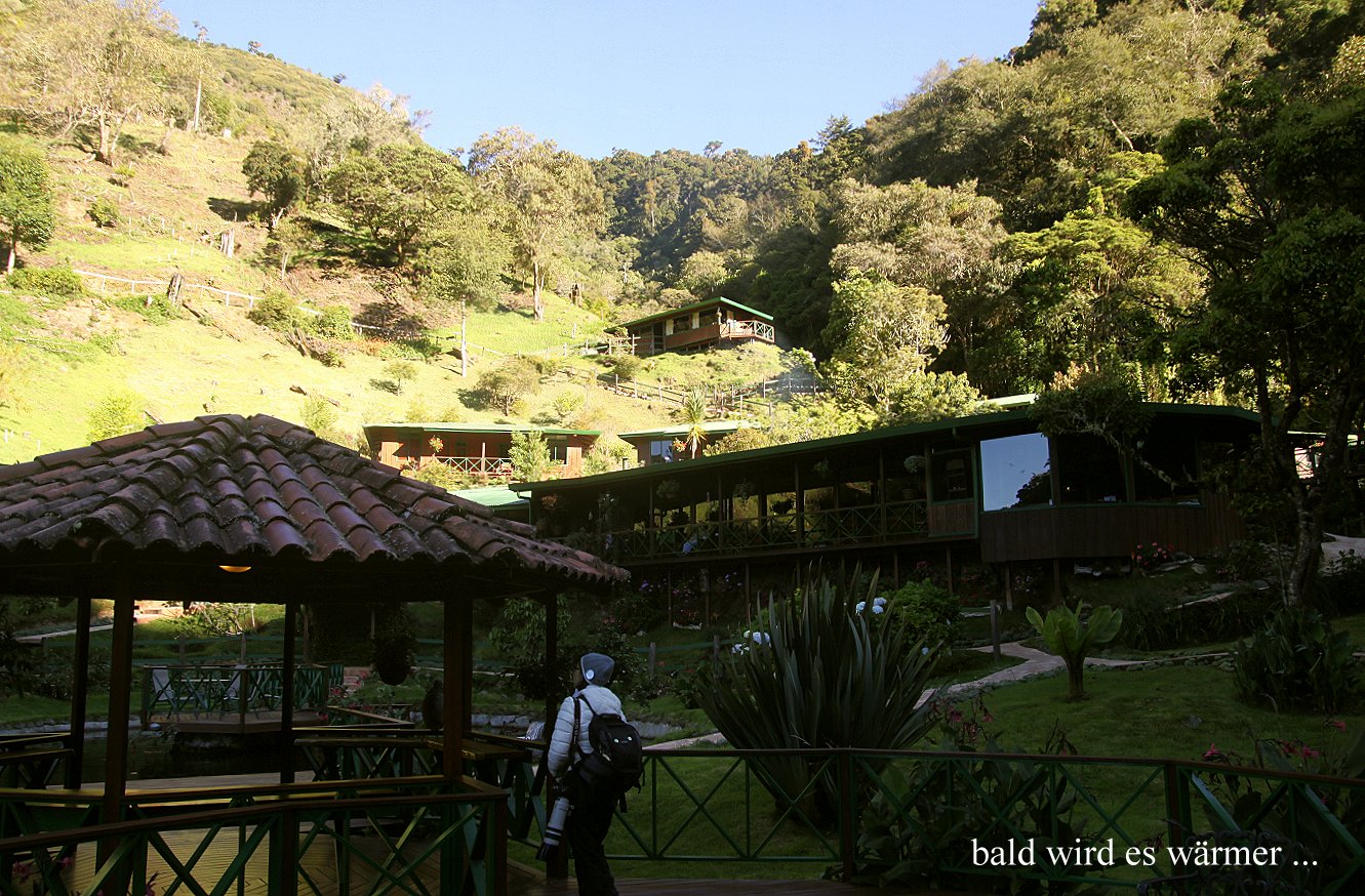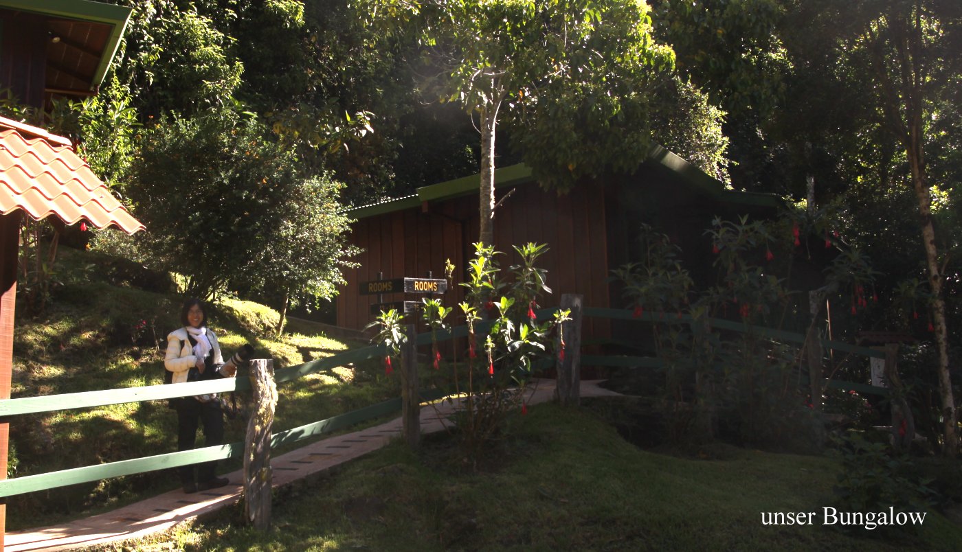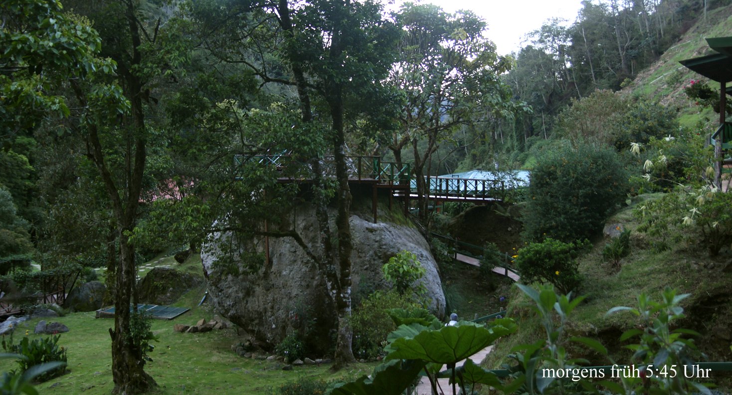 Das Zimmer war durch die Gasheizung in der Nacht angenehm warm und die Wärmeflasche tat ihr übriges dazu, dass wir nicht froren. Wir wachten kurz nach 5:00 h auf. Ein Blick aus dem Fenster signalisierte schönes Wetter, wenn es auch höchstens 6° draußen waren. Wir blieben bis 5:30 h in dem warmen gemütlichen Bett liegen. Da wir wussten, dass um 5:30 h eine Gruppe mit Führer gestartet war um einen Quetzal zu sehen, standen wir auch auf, zogen uns an und fuhren ein paar hundert Meter den Weg nach unten bis wir die Gruppe stehen sahen. Wir parkten das Auto, stiegen aus und gingen ein paar Schritte weiter. Ein Quetzal war wohl soeben gesichtet worden, war aber weggeflogen. Wir warteten eine Weile und fuhren ein kleines Stück weiter, da wir ja die Führung, die immerhin 18,- $ pro Person kostete, nicht bezahlt hatten. Da kamen uns aus der anderen Richtung mehrere Autos entgegen. Ein Führer drehte seine Autoscheibe herunter und fragte uns , ob wir den Quetzal gesehen hätten. Hatten wir nicht, aber wir deuteten zurück. Wir fuhren ebenfalls zurück und da jetzt mehrere Gruppen gemischt auf dem Weg standen, gesellten wir uns auch dazu. Tomoko entdeckte plötzlich einen Quetzal etwas entfernt in einem Baum sitzen. Sofort versuchten alle Führer ihre Spektive auf den Vogel auszurichten. Der blieb aber nicht lange dort sitzen sondern flog weiter. Immerhin hatten wir einen gesehen. Da wir in Monteverde so gute Gelegenheiten hatten, diesen prächtigen Vogel ganz nah beobachten zu können, waren wir nicht allzu enttäuscht sondern fuhren gegen 7:00 h zurück zum Frühstück. |