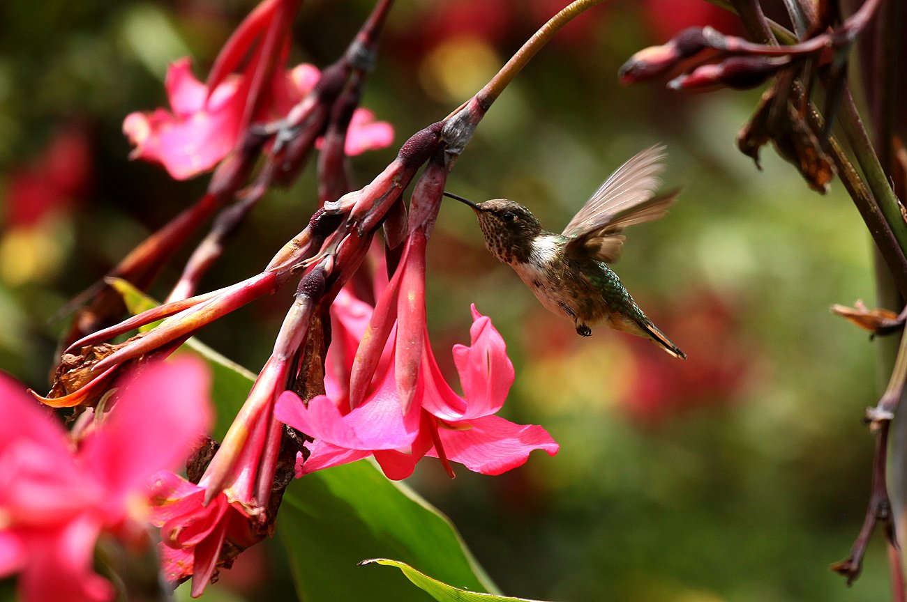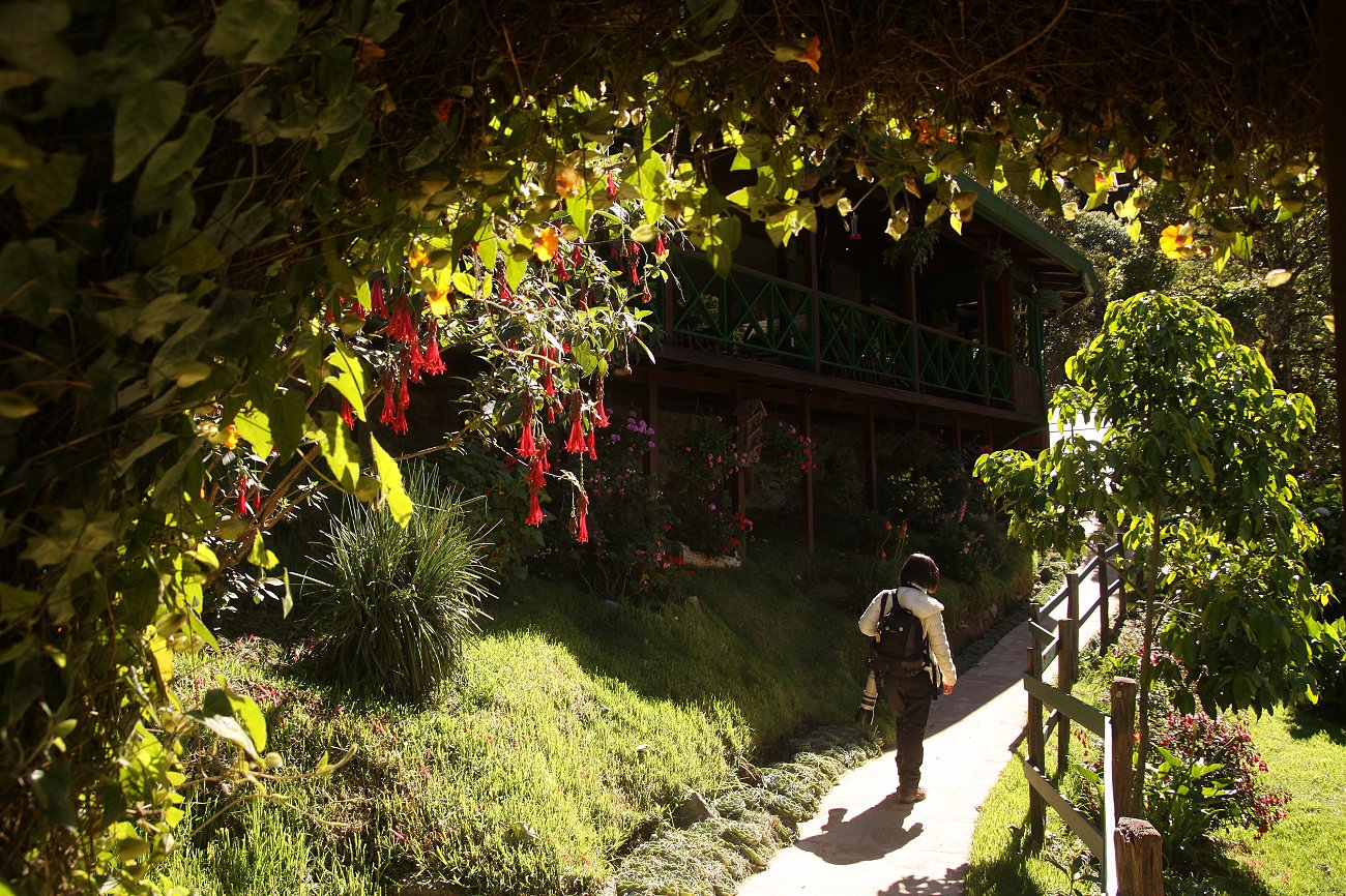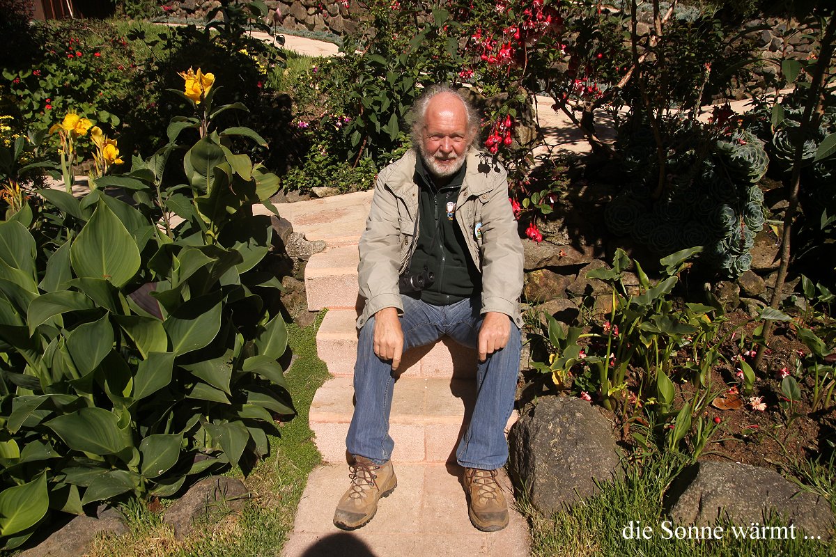 Inzwischen hatte es die Sonne geschafft über die hohen Berge ringsum ins Tal zu scheinen. Dadurch entstand sofort ein viel freundlicheres farbigeres Bild der Landschaft und es wurde zunehmend wärmer. Der Himmel war wolkenlos und das Blau hatte wegen der Höhe von 2.400 m eine kräftig dunkle Farbe. Wir schauten eine Weile den Kolibris zu, die auf der Veranda die zahlreichen Futtergefäße aber auch die bunten Blumenblüten besuchten. |
