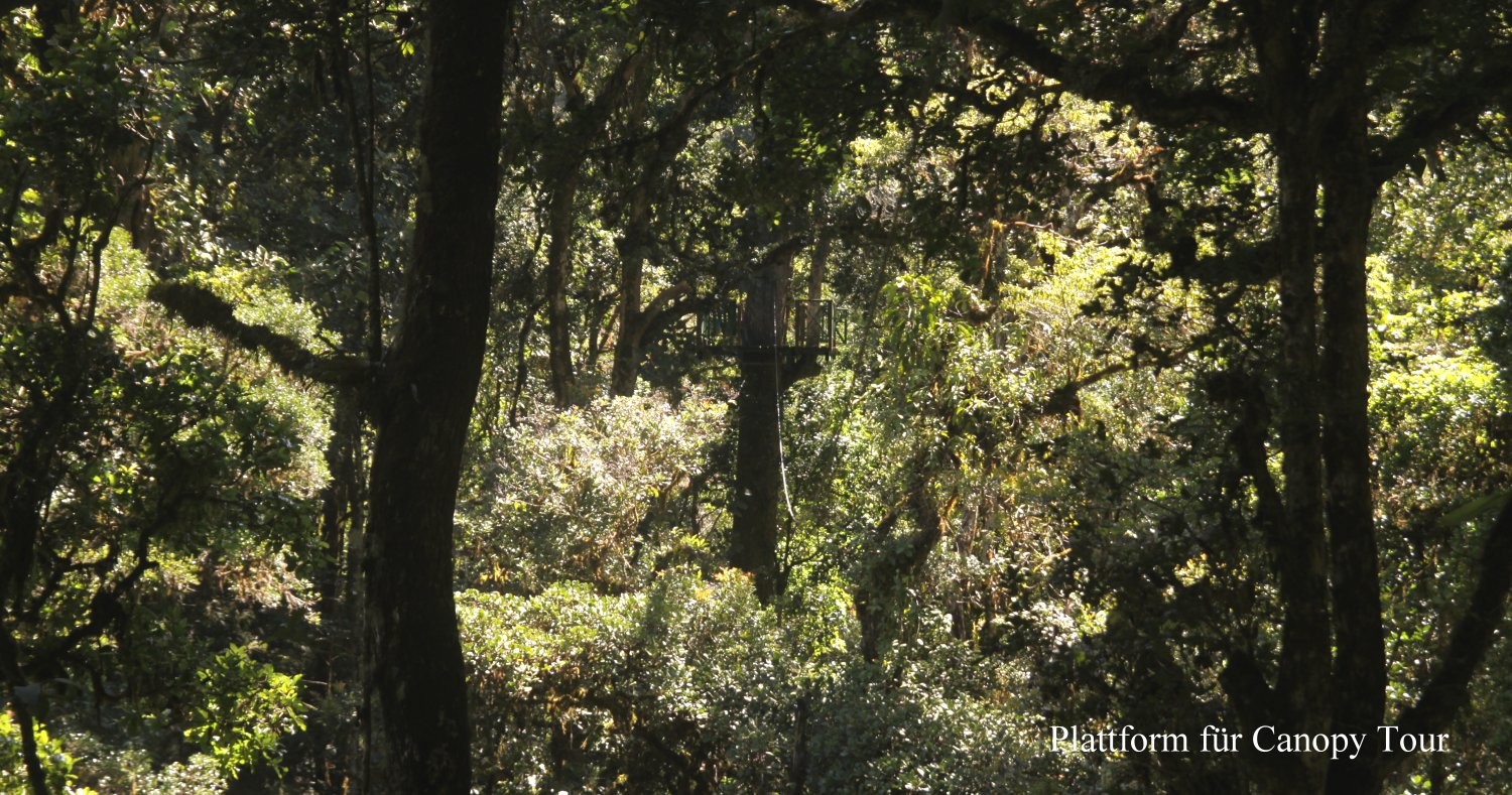 Nach dem Frühstück wanderten wir in den nahen Wald. Ein kleiner Rundweg startete direkt bei unserem Bungalow. Es ging stellenweise sehr steil auf und ab und wir kamen in Anbetracht der Höhe ziemlich schnell außer Atem. Man hat hier Seile für eine Canopy Tour gespannt, ein neuartiges Freizeitvergnügen, das uns aber nicht sonderlich interessierte. |
