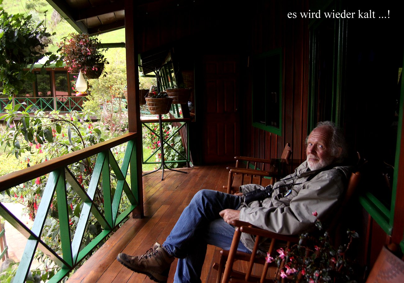 Zurück bei der Lodge blieben wir eine Weile auf der Veranda des Restaurants sitzen und beobachteten die verschiedenen Kolibris, die teilweise so nah waren, dass man sie hätte berühren können. Dabei wurde es zunehmend kälter. |